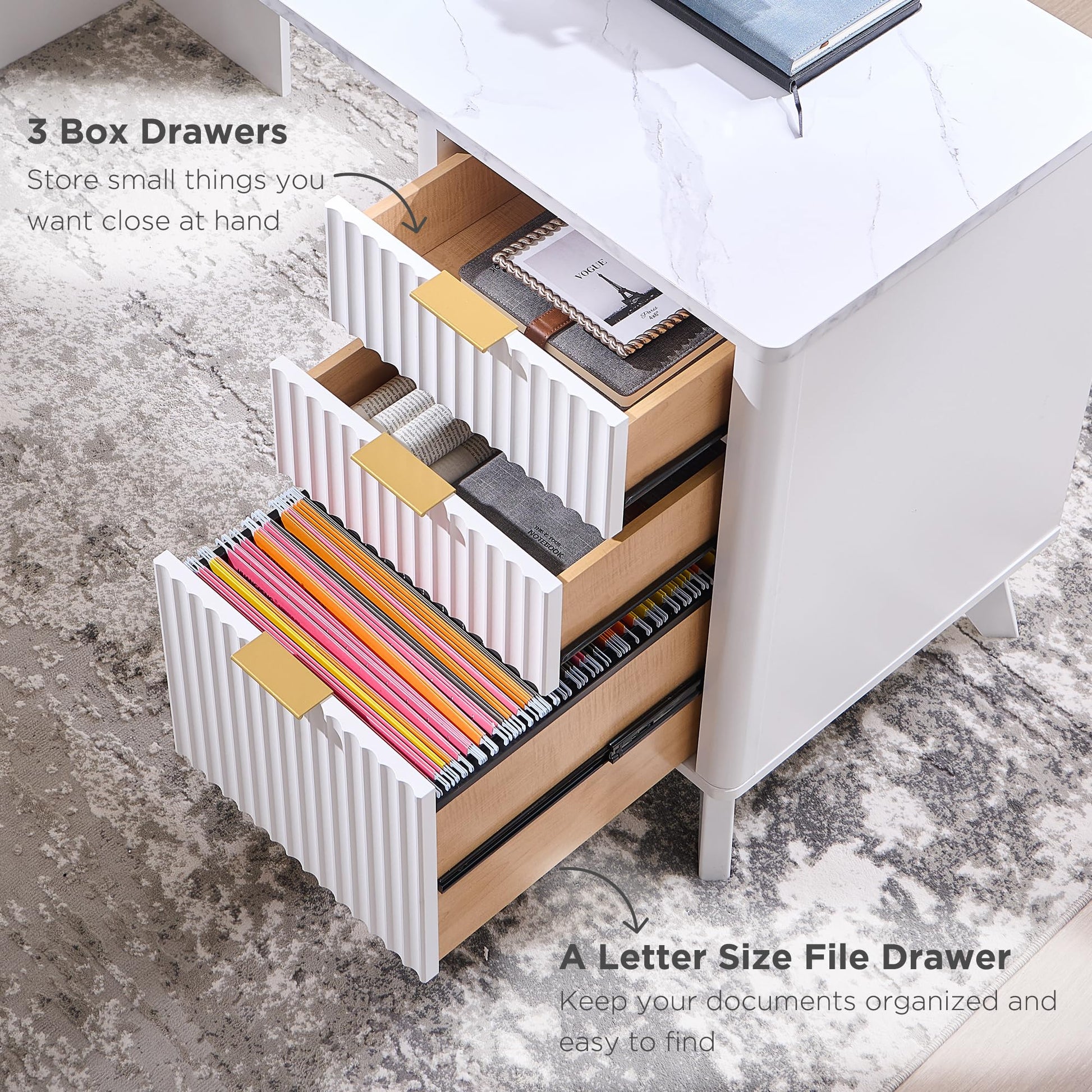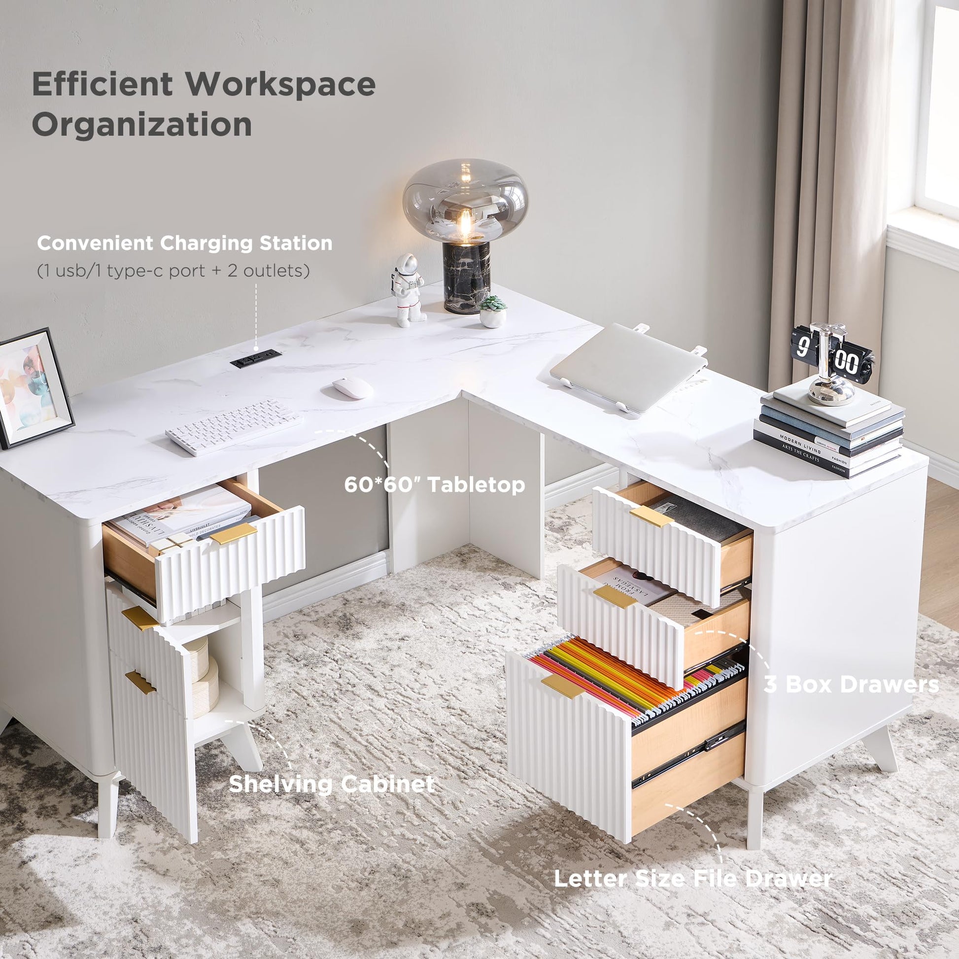 Upgrade your workspace with this modern L-shaped executive desk featuring a spacious 60-inch work surface, integrated charging station, and comprehensive storage solutions. Crafted from FSC-certified wood and P2 engineered MDF with a fluted panel design and smooth curved edges, this desk combines timeless aesthetics with robust functionality.