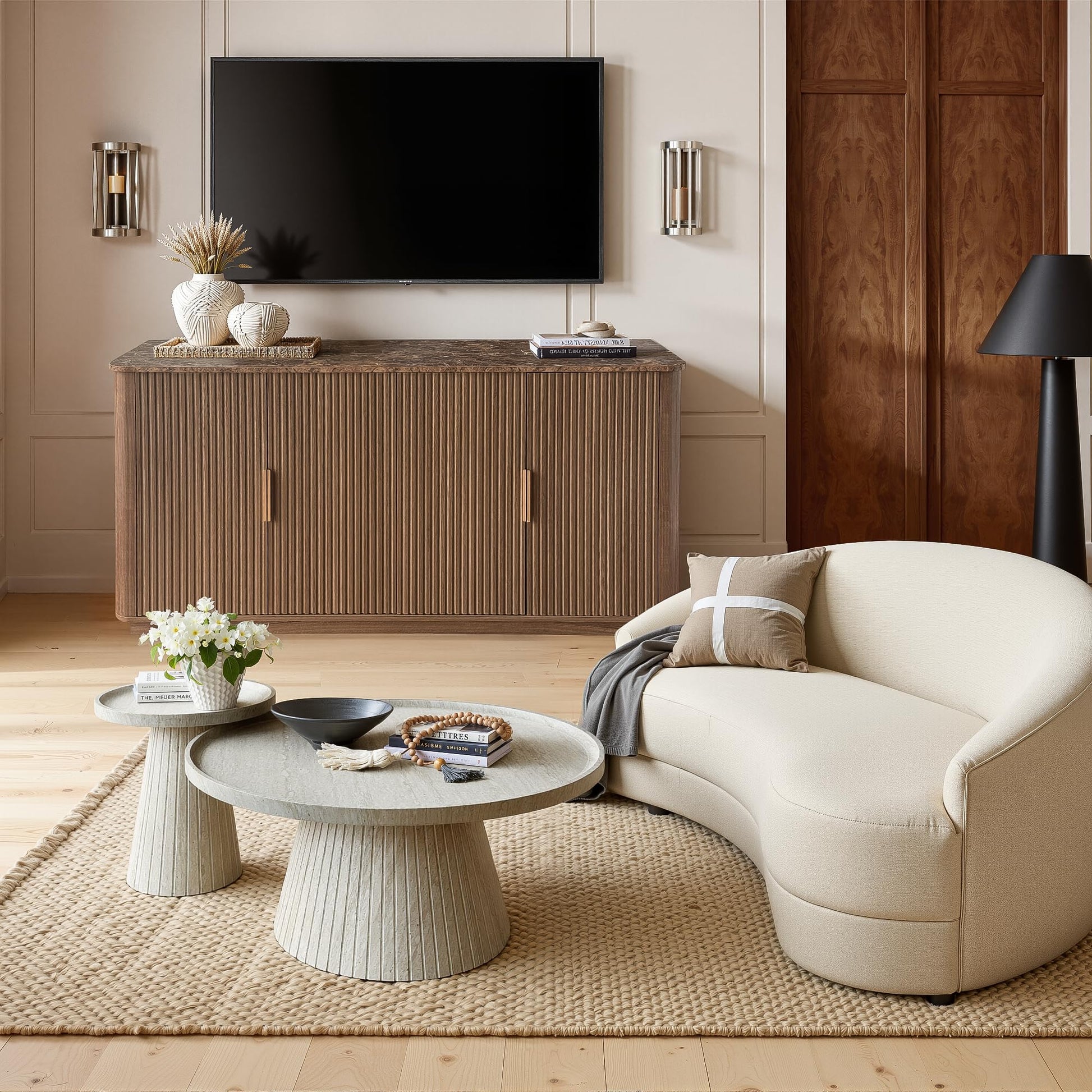 - Timeless Mid-Century Design: Fluted walnut finish with wave-textured doors, curved edges, and soft-close hinges for a sophisticated aesthetic