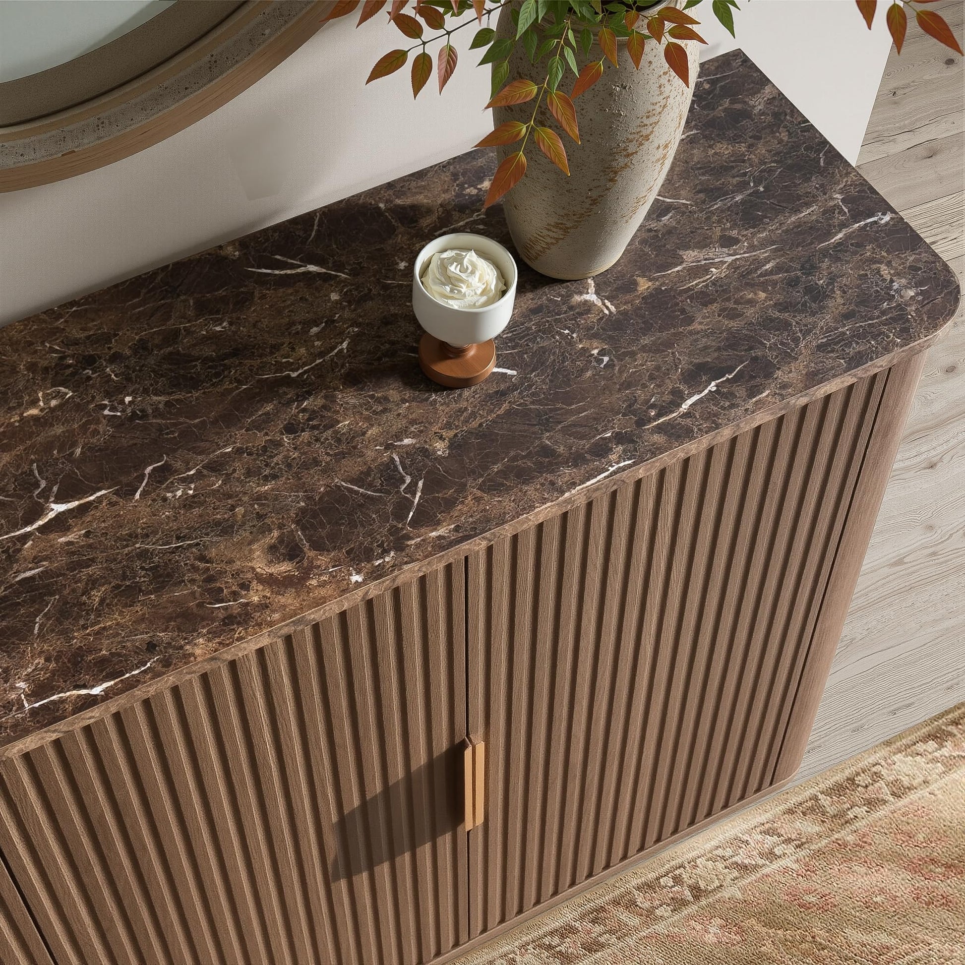Redefine your home with this timeless mid-century modern sideboard featuring sculpted wave-textured fluted doors, curved edges, and a sophisticated faux marble top. The rounded silhouette and sleek modular layout add warmth and artistry to any space. Perfect for living rooms, dining rooms, entryways, or hallways.