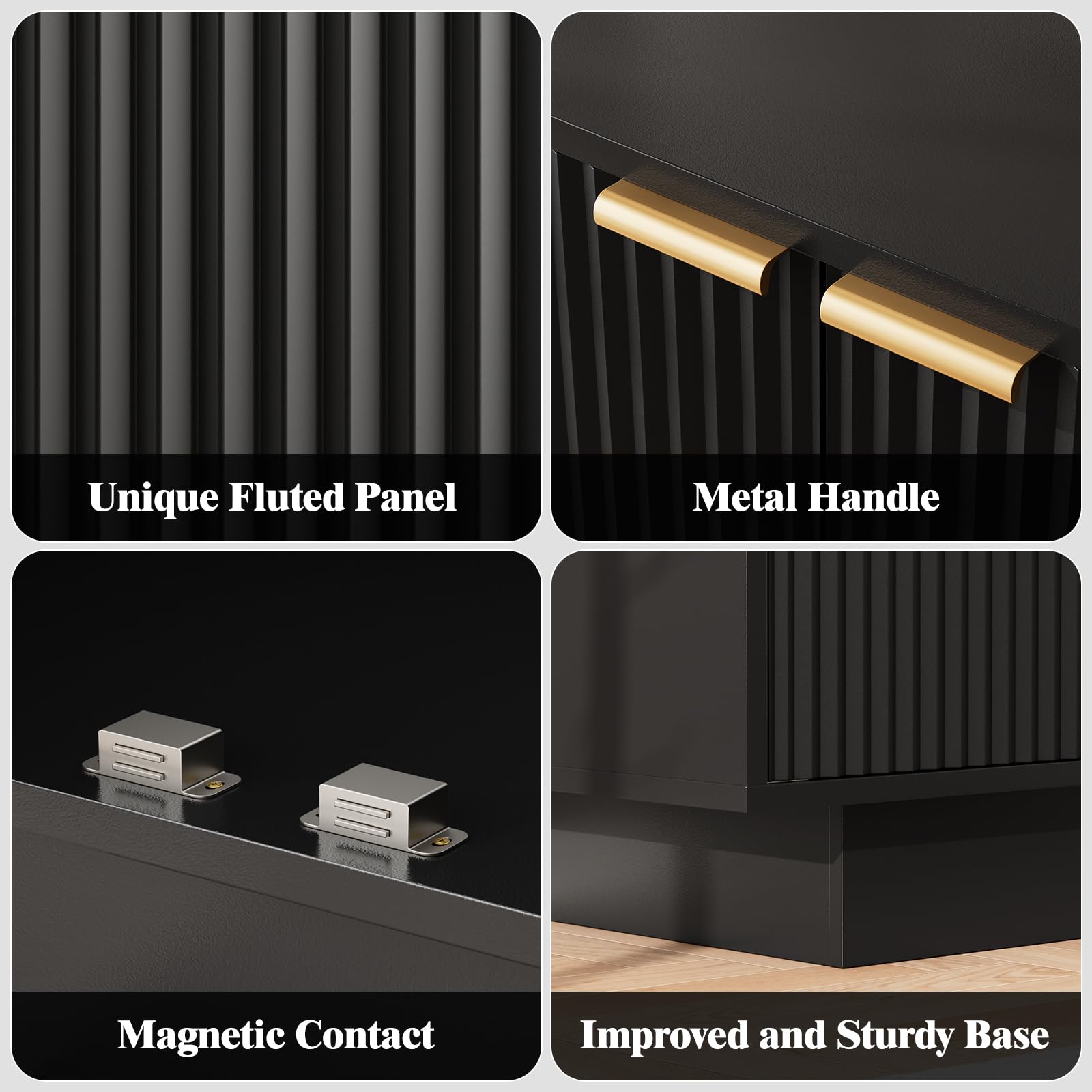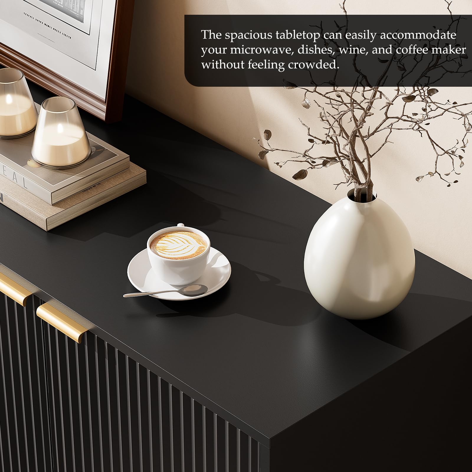 This extra-large sideboard buffet cabinet offers exceptional storage capacity with modern minimalist design. Featuring unique wave-shaped panel doors with integrated magnetic closures, this versatile piece serves multiple functions throughout your home.