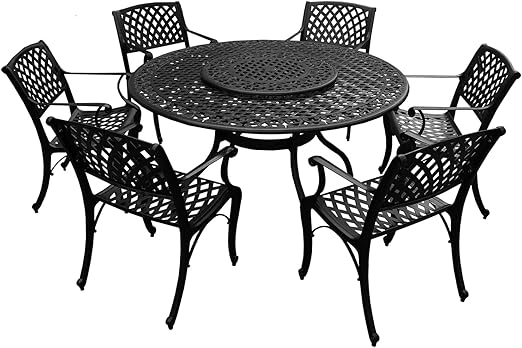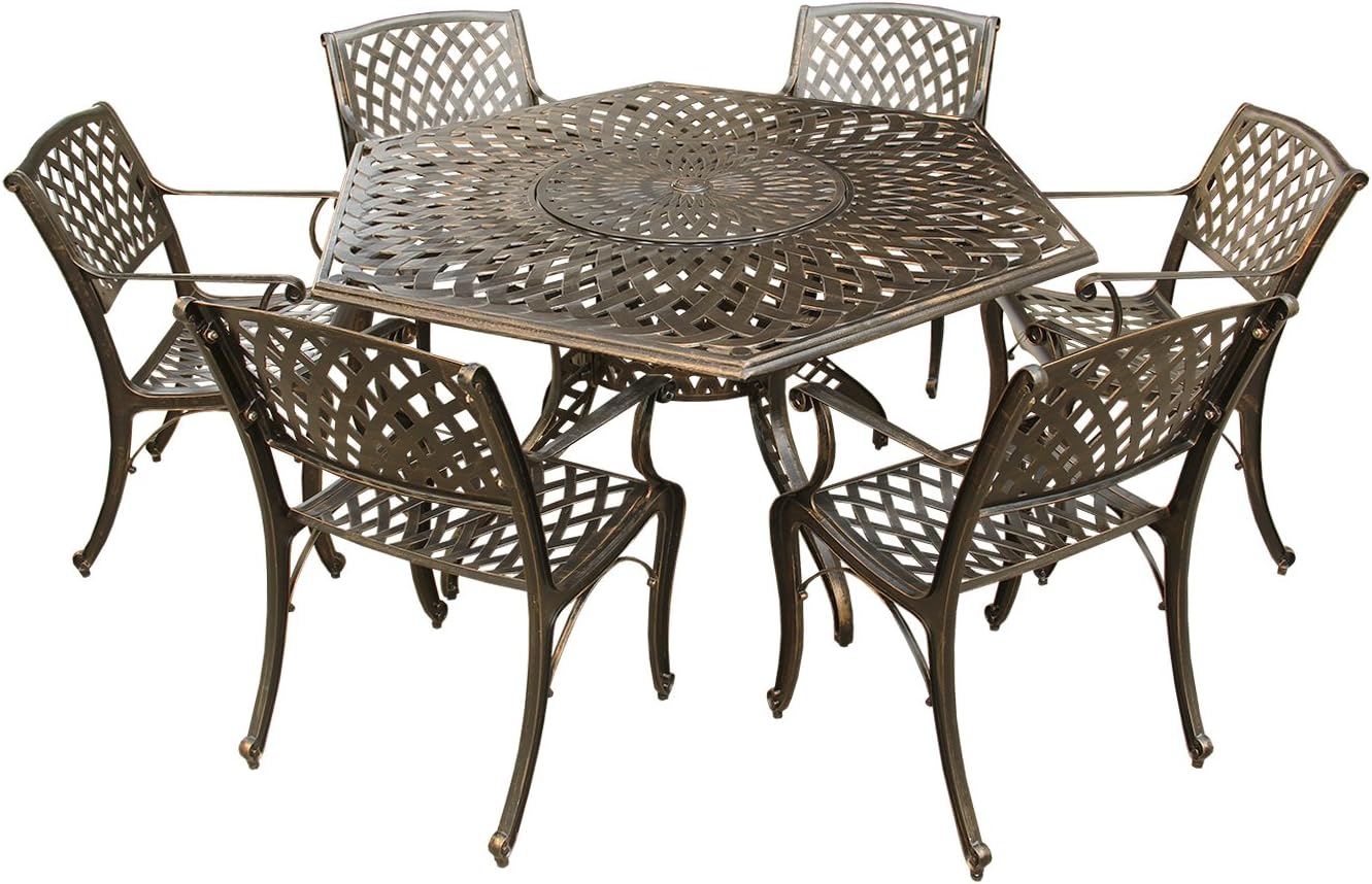 This contemporary outdoor dining set features a large hexagonal table with an integrated lazy susan, perfect for entertaining and family gatherings. Crafted from durable cast aluminum with a UV-resistant powder-coated bronze finish, this set combines modern aesthetics with long-lasting performance.