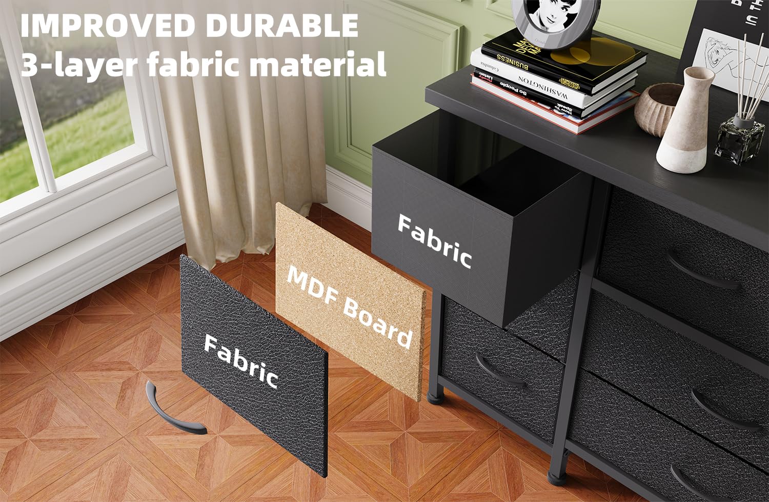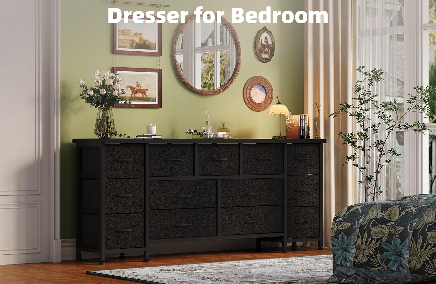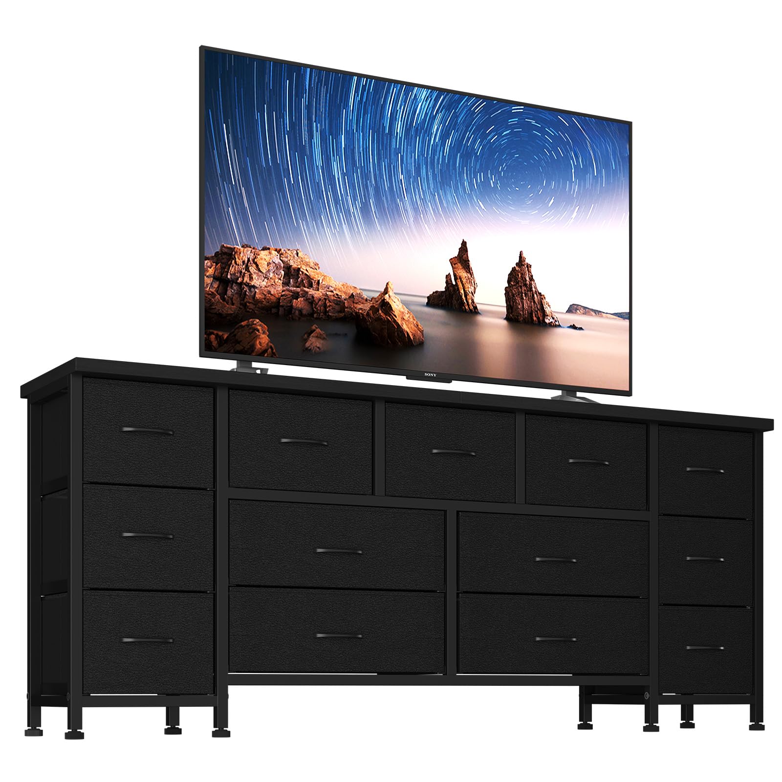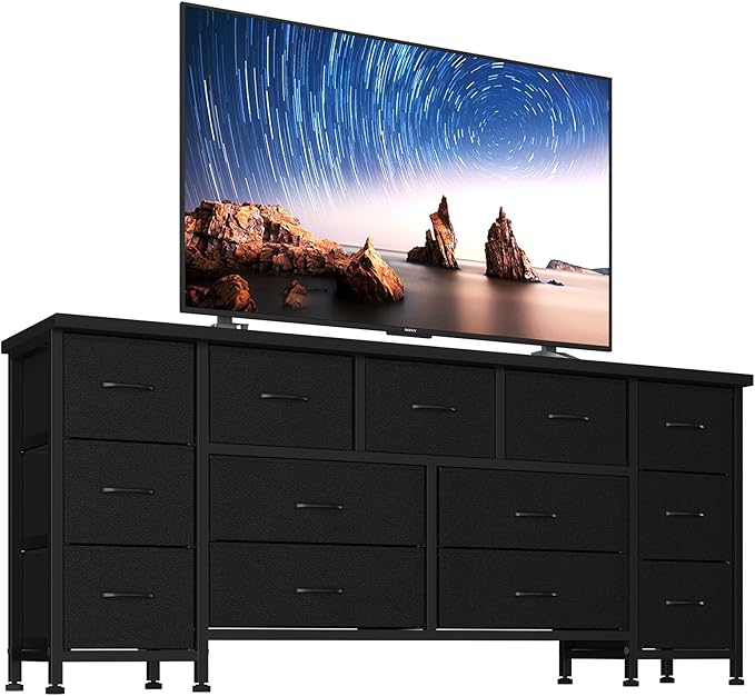 This spacious dresser combines functionality with modern design, offering exceptional storage capacity for bedrooms, living rooms, or closets. Featuring 13 generously sized drawers, this entertainment center accommodates TVs up to 70 inches while providing ample organization space for clothing, linens, and accessories.