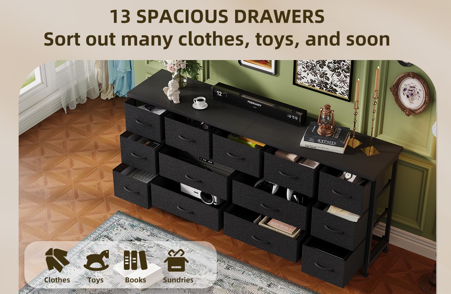- 13 spacious drawers for maximum storage capacity