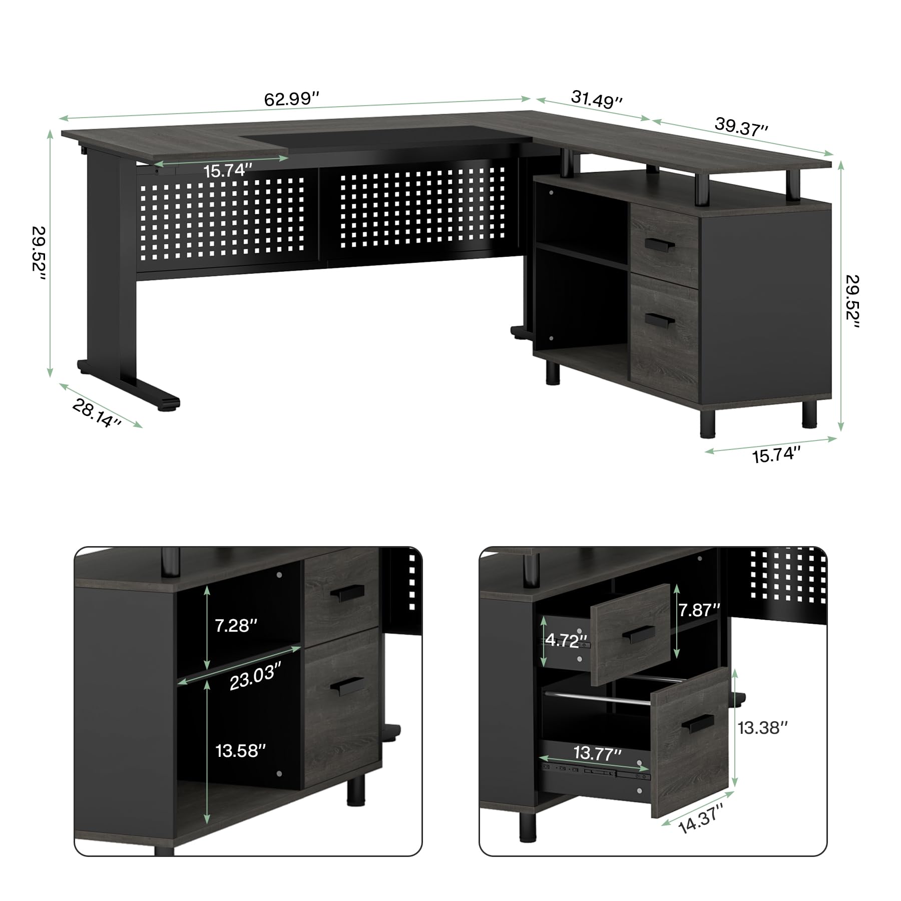 63 Inch L Shaped Desk with File Cabinet and Storage Shelves