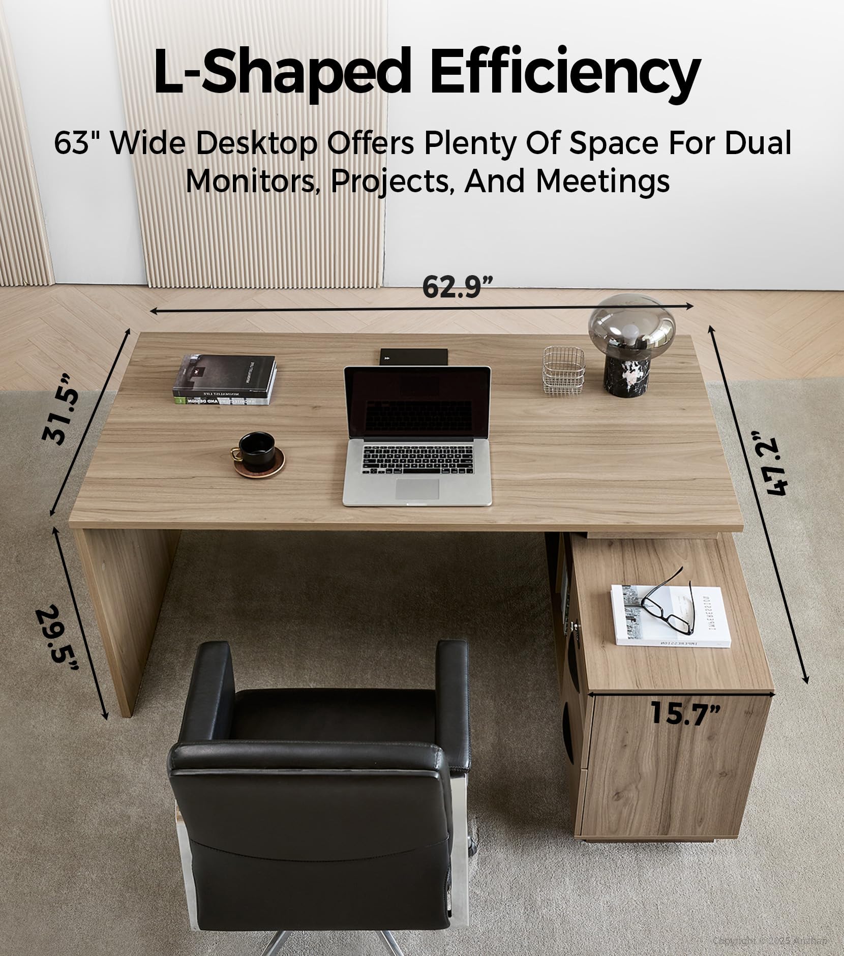 63-Inch Reversible L-Shaped Executive Desk with Lateral File Cabinet