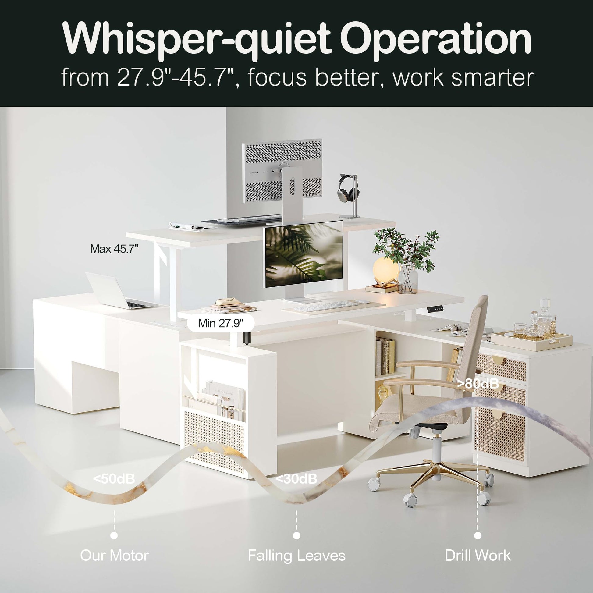Transform your workspace with this premium electric height-adjustable standing desk. Featuring a spacious L-shaped design with integrated file cabinet and privacy panel, this executive desk combines functionality with modern aesthetics.
