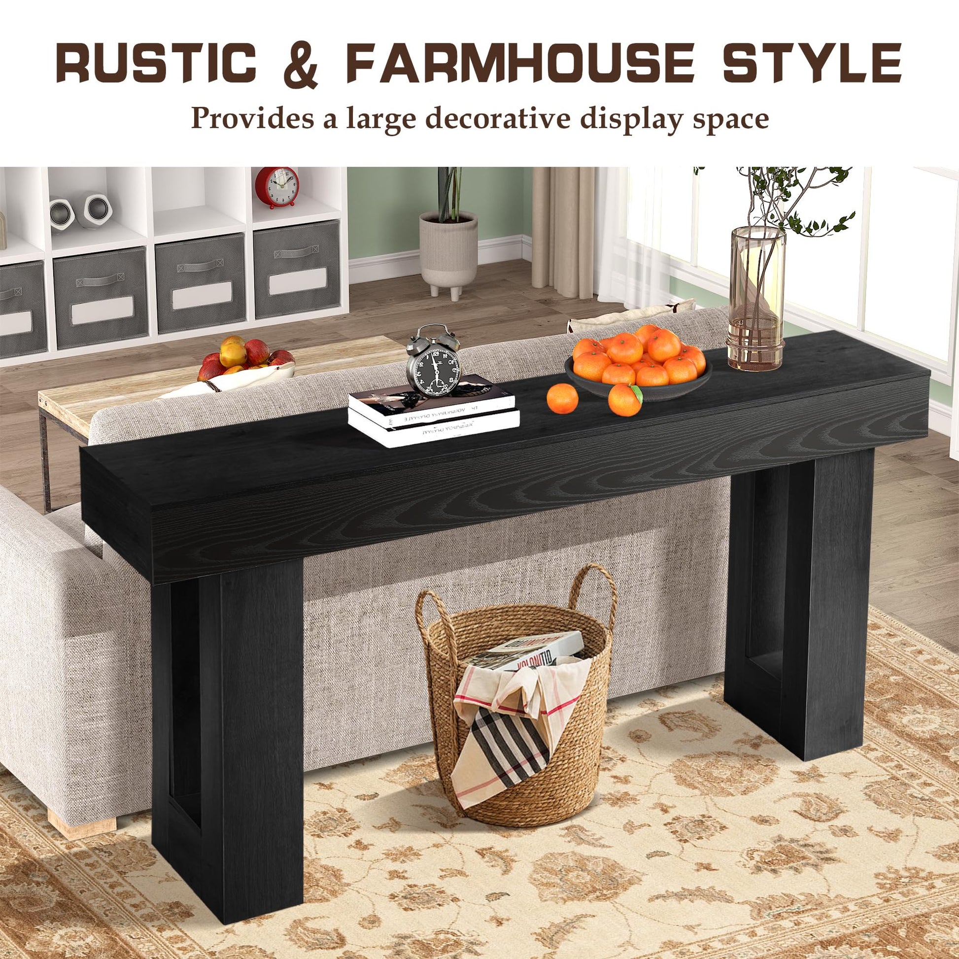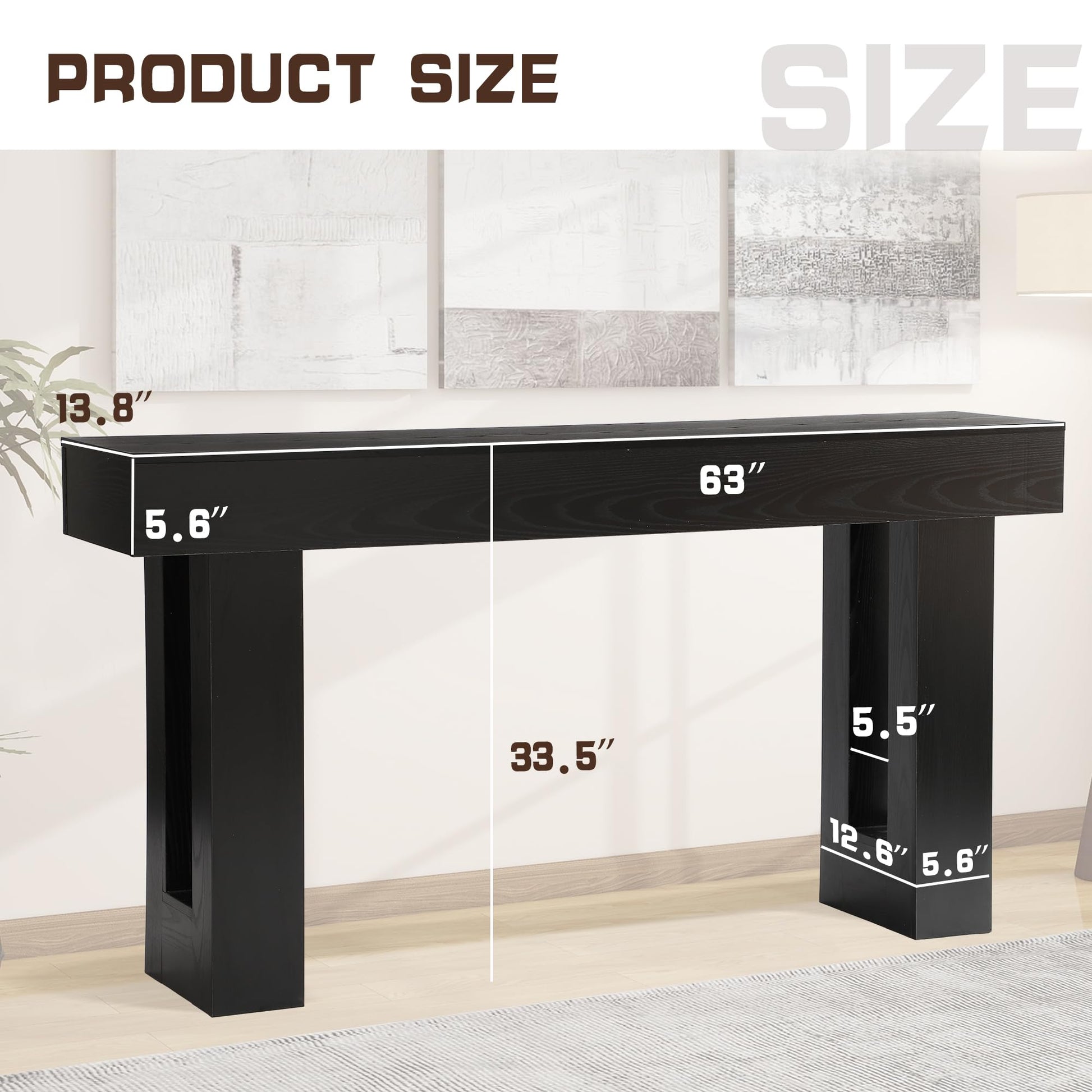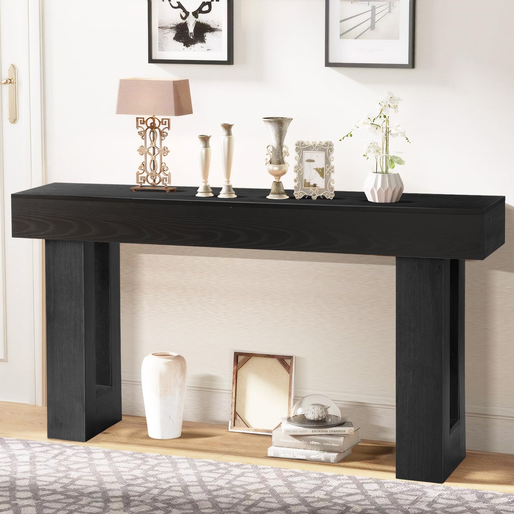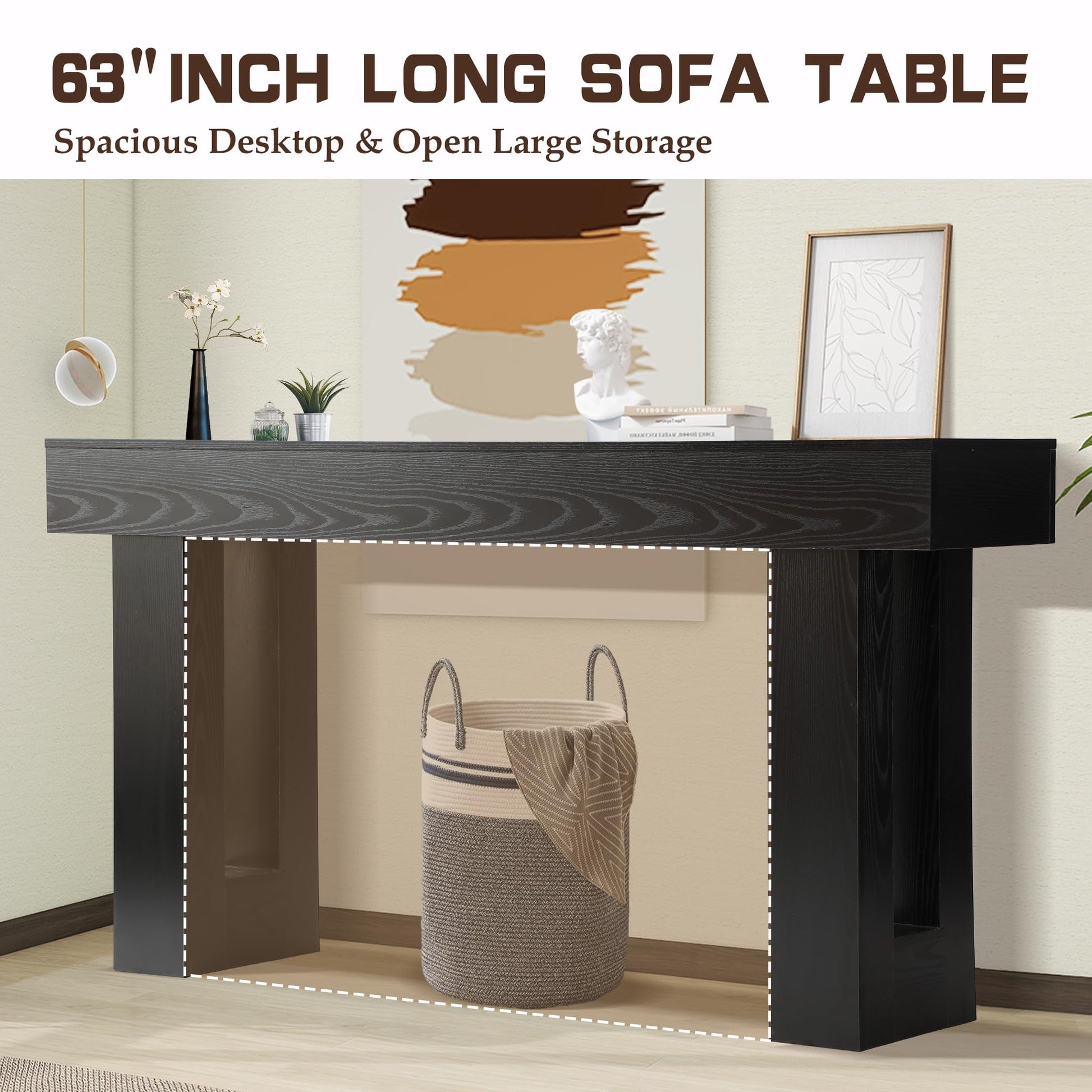 Transform your entryway, hallway, or living room with this elegant 63-inch long console table. Featuring a sleek rectangular design with two-tier open storage, this versatile piece combines functionality with contemporary style. The weighted base ensures stability, while the rich black finish complements any décor.