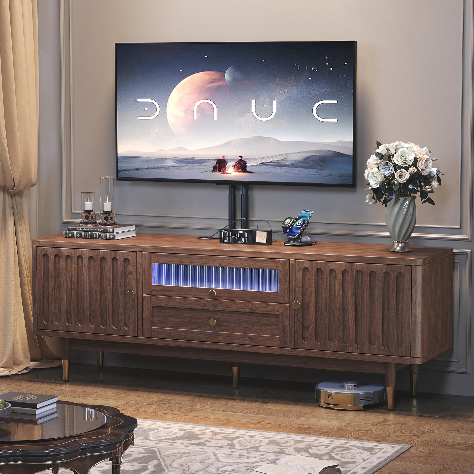 Transform your living space with this elegant mid-century modern entertainment center. Featuring arched grooved doors, ribbed glass accents, and smart LED lighting, this TV stand combines timeless design with modern functionality.