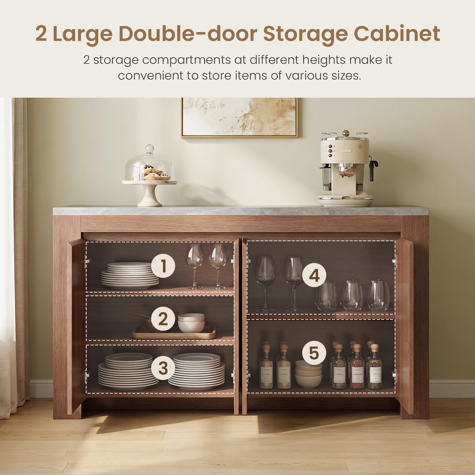 This elegant sideboard buffet cabinet combines premium aesthetics with exceptional functionality. Featuring a spacious faux marble top and ample storage, this versatile piece serves as a sophisticated addition to any dining room, living room, kitchen, or entryway.