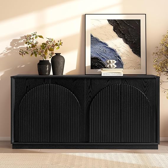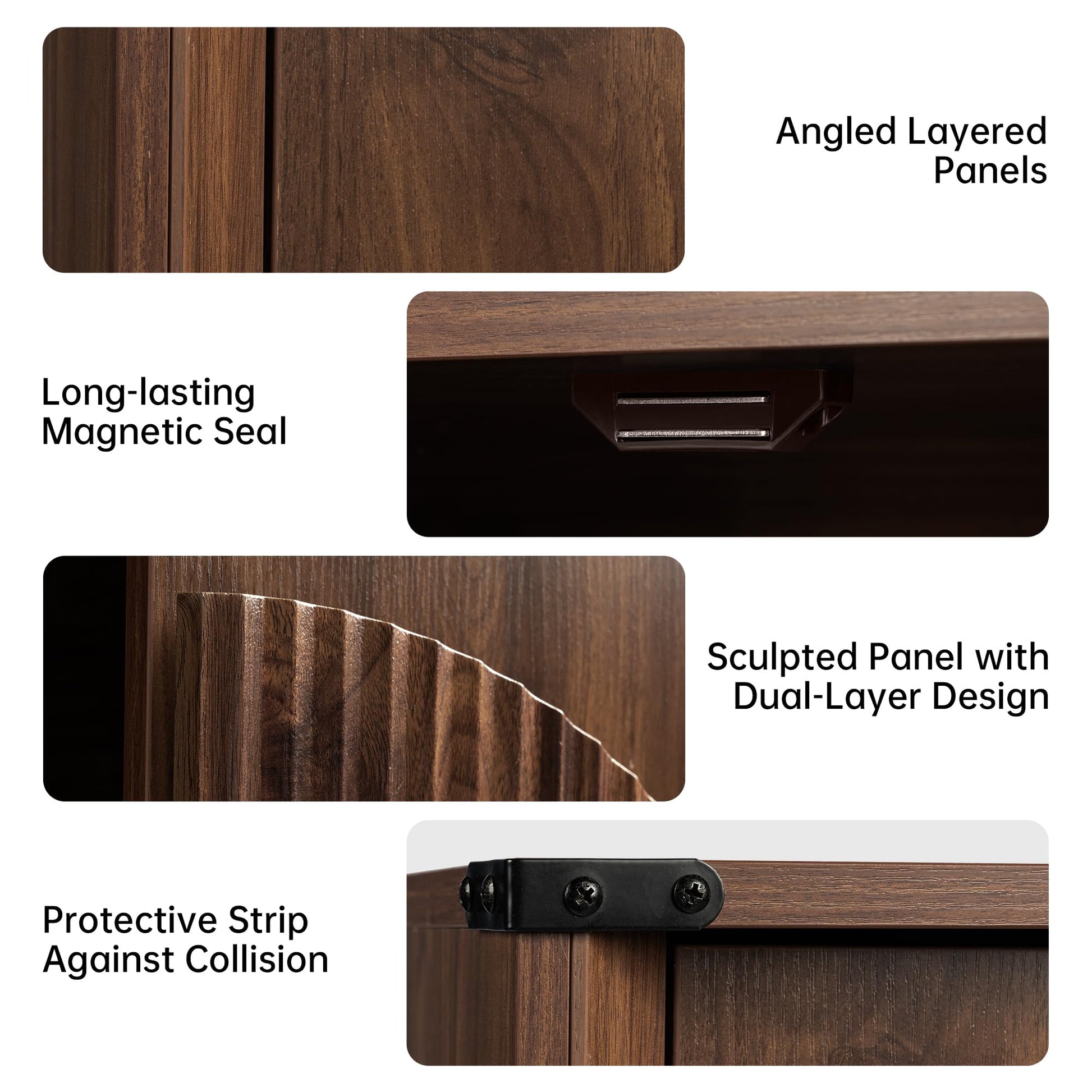 This elegant sideboard buffet cabinet combines modern design with practical storage solutions. Featuring intricately carved fluted arches and a warm walnut finish, it seamlessly integrates into any contemporary interior while providing ample storage space.