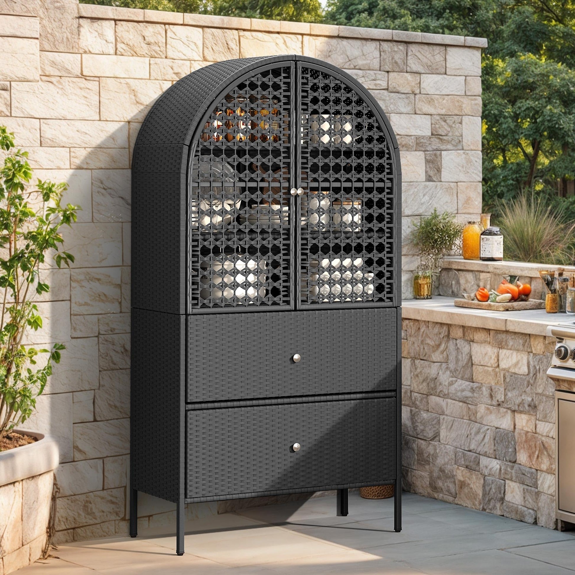 Transform your outdoor space with this versatile arched wicker storage shed. Designed for durability and functionality, this stand-up pantry combines rustic charm with practical storage solutions for your backyard, garden, patio, or lawn.