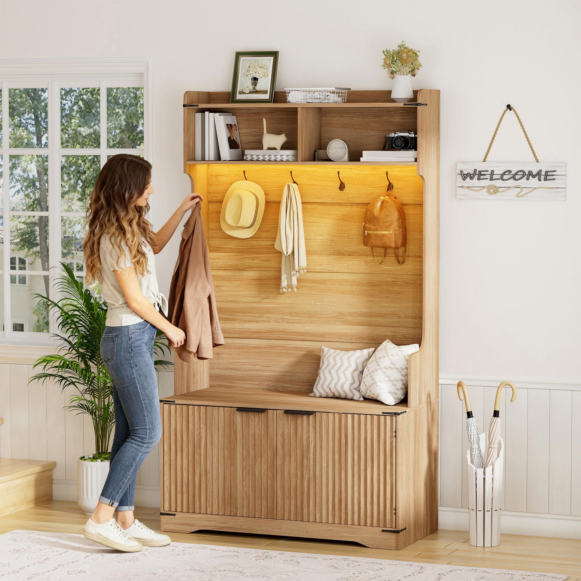 Transform your entryway with this versatile 5-in-1 hall tree that combines a coat rack, flip-up shoe cabinet, shoe changing bench, storage compartments, and adjustable LED lighting in one elegant piece of furniture.
