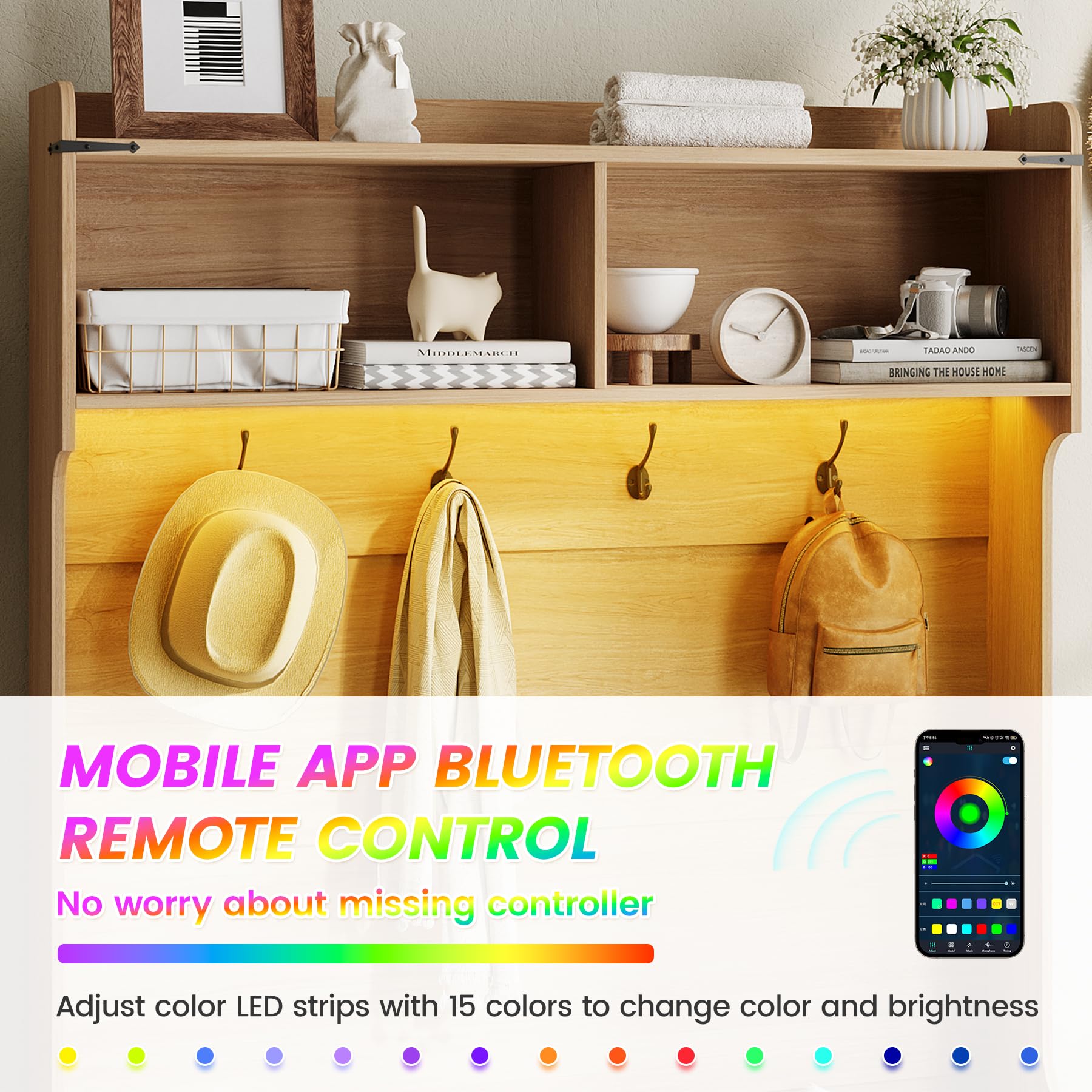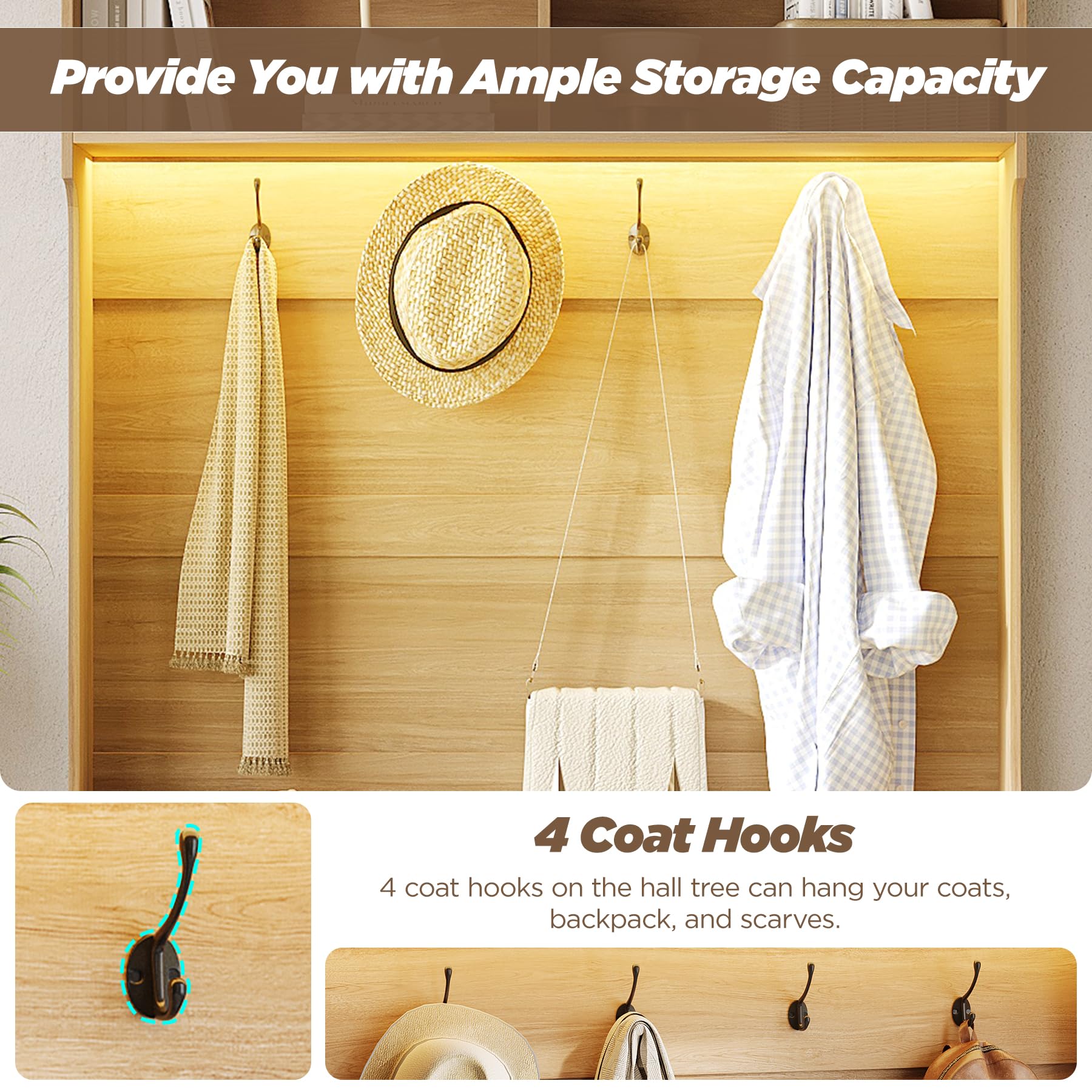 - 5-in-1 Multifunctional Design: Combines coat rack, shoe cabinet, changing bench, storage, and LED lighting