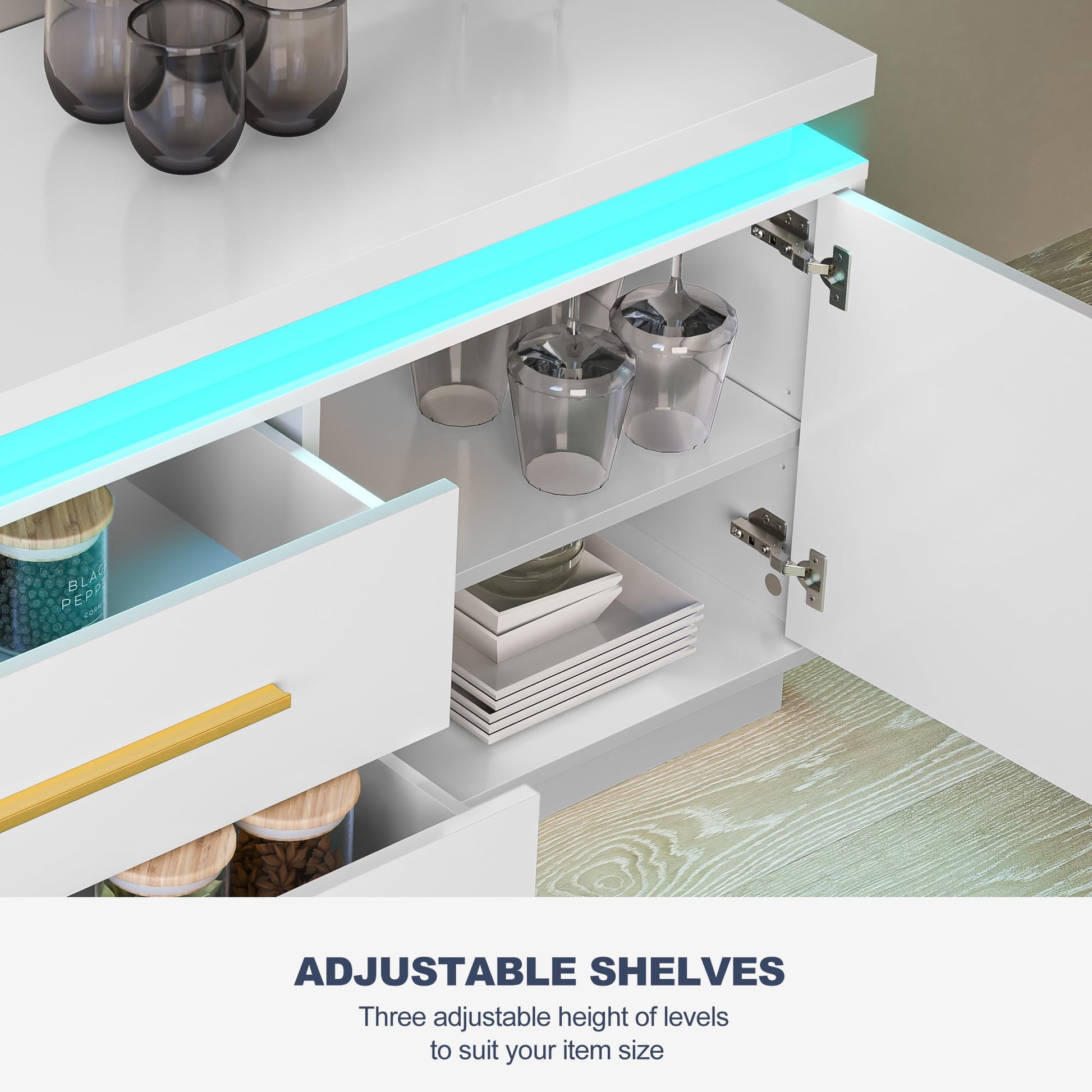 - Multiple storage compartments including cabinets and drawers