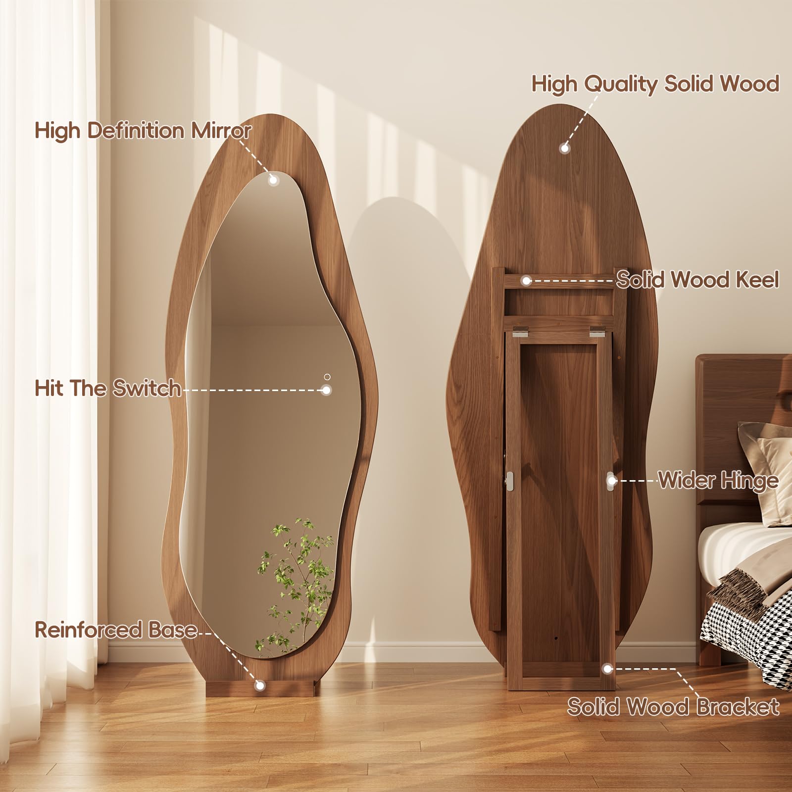 Crafted with a beautiful walnut finish frame, this mirror combines functionality with sophisticated design. The wavy silhouette creates visual interest and makes a bold statement piece in your home decor.