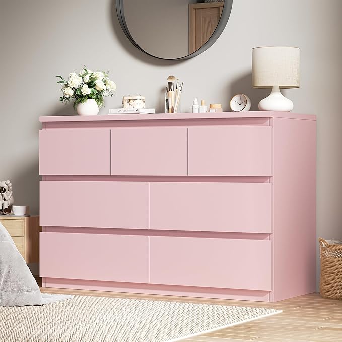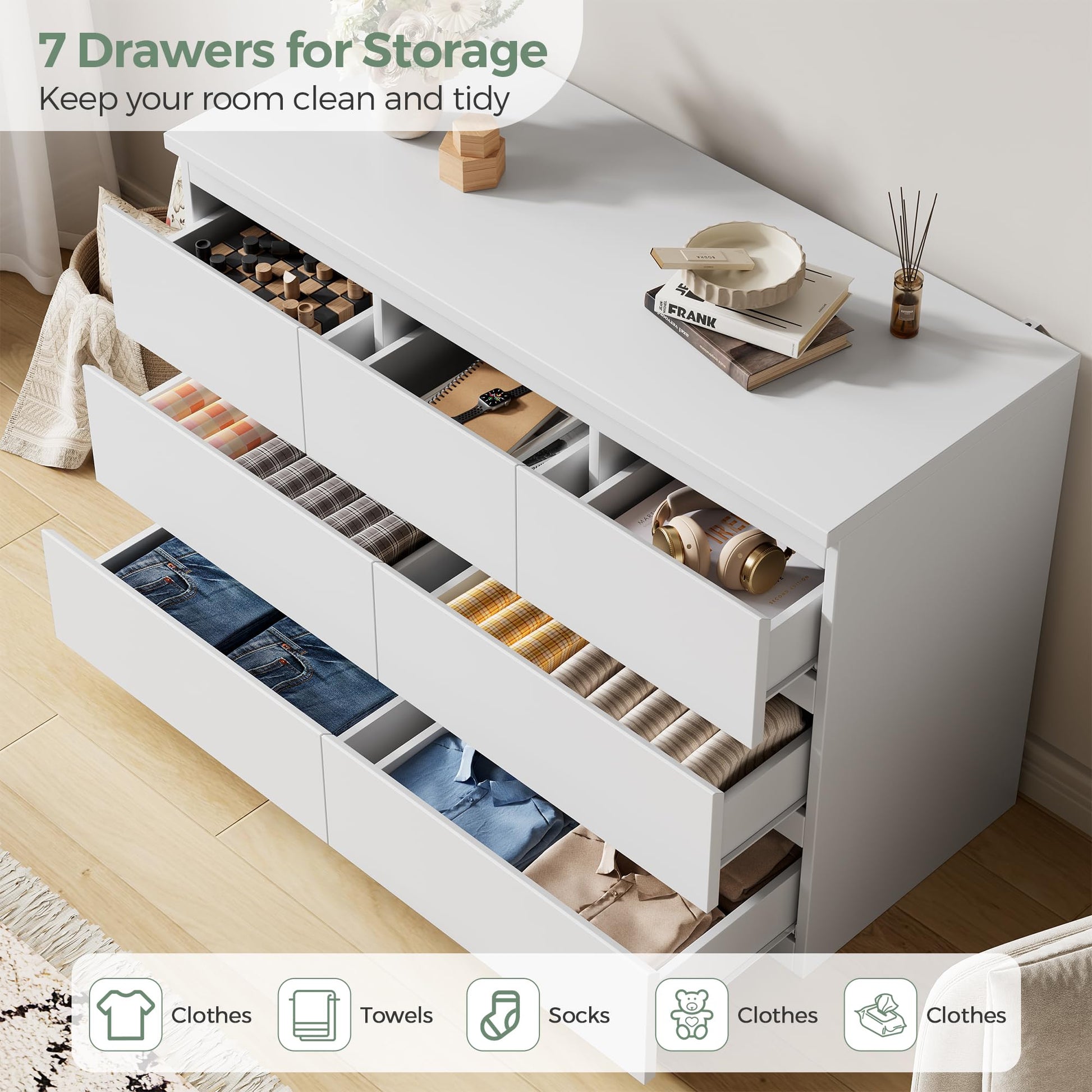 This modern 7-drawer dresser offers exceptional storage capacity with deep drawers designed for bedroom, living room, hallway, or entryway use. Crafted from durable wood with a clean white finish, this chest of drawers combines functionality with contemporary style.