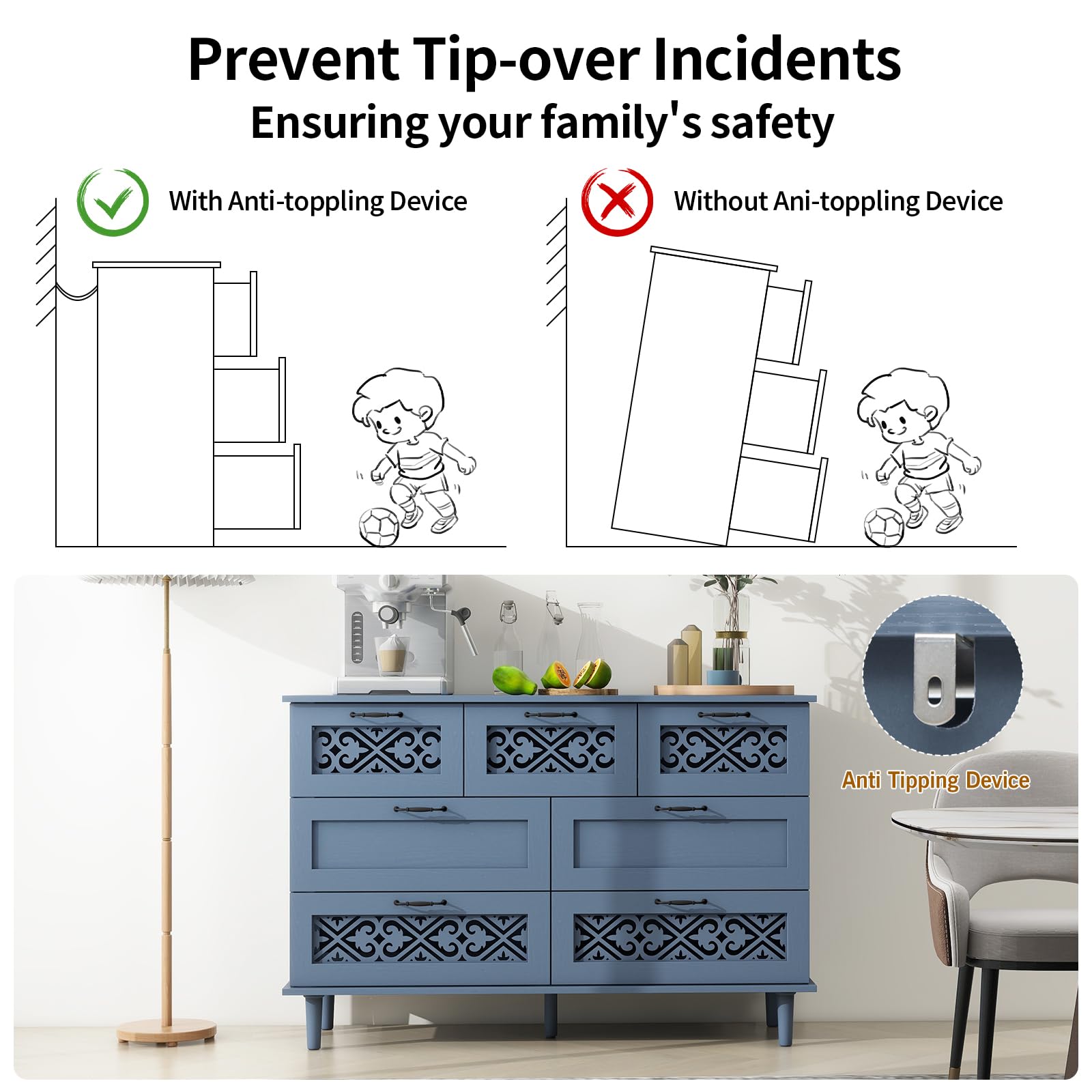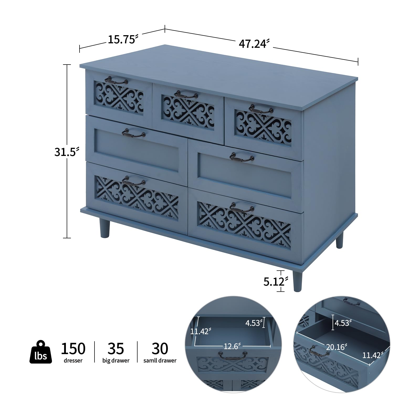 This elegant vintage-style dresser combines functionality with timeless design, featuring seven spacious drawers with distinctive hollow carved details. Crafted from quality wood with a beautiful blue finish, this versatile chest of drawers provides ample storage while serving as a stunning accent piece.