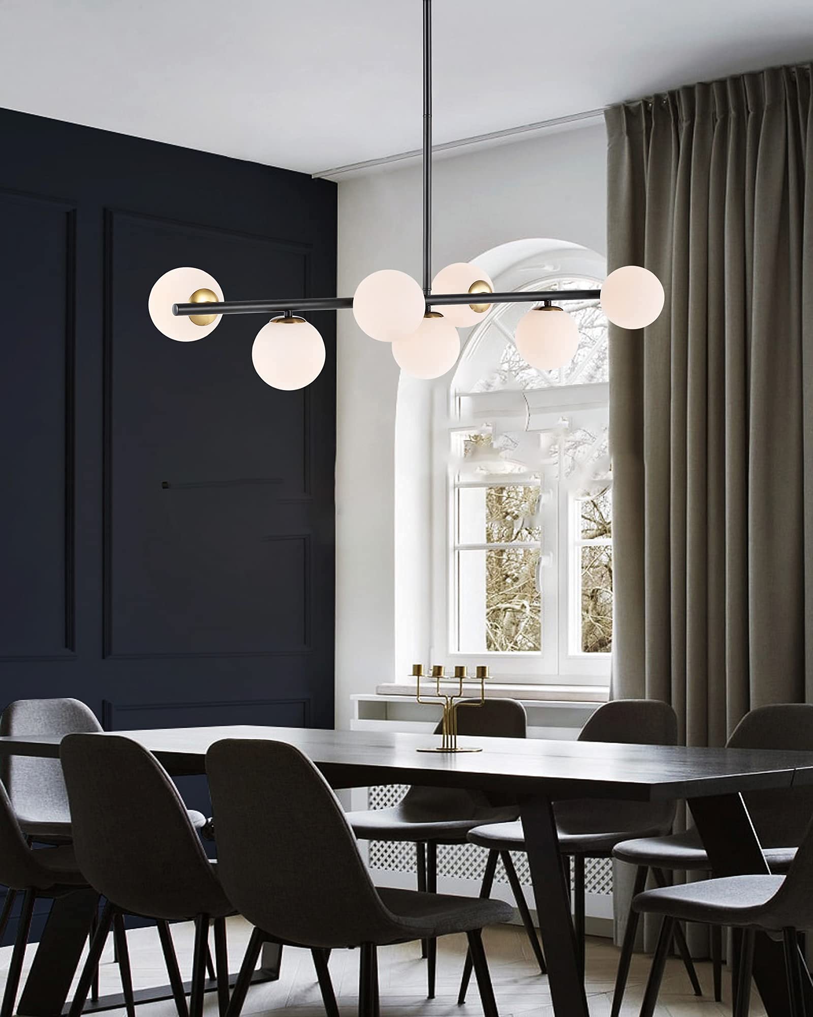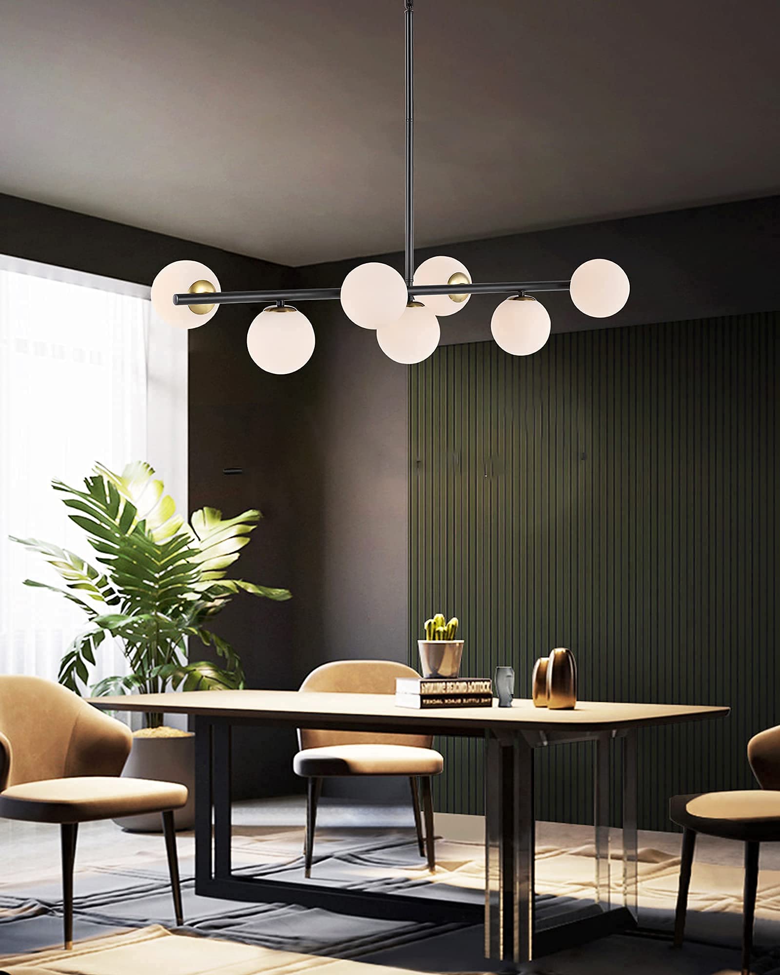 This elegant 7-light chandelier features eye-catching white globe glass shades surrounding a polished metal body, creating a perfect blend of classic and contemporary design. The linear sputnik style adds a stylish focal point while providing excellent illumination for your space.
