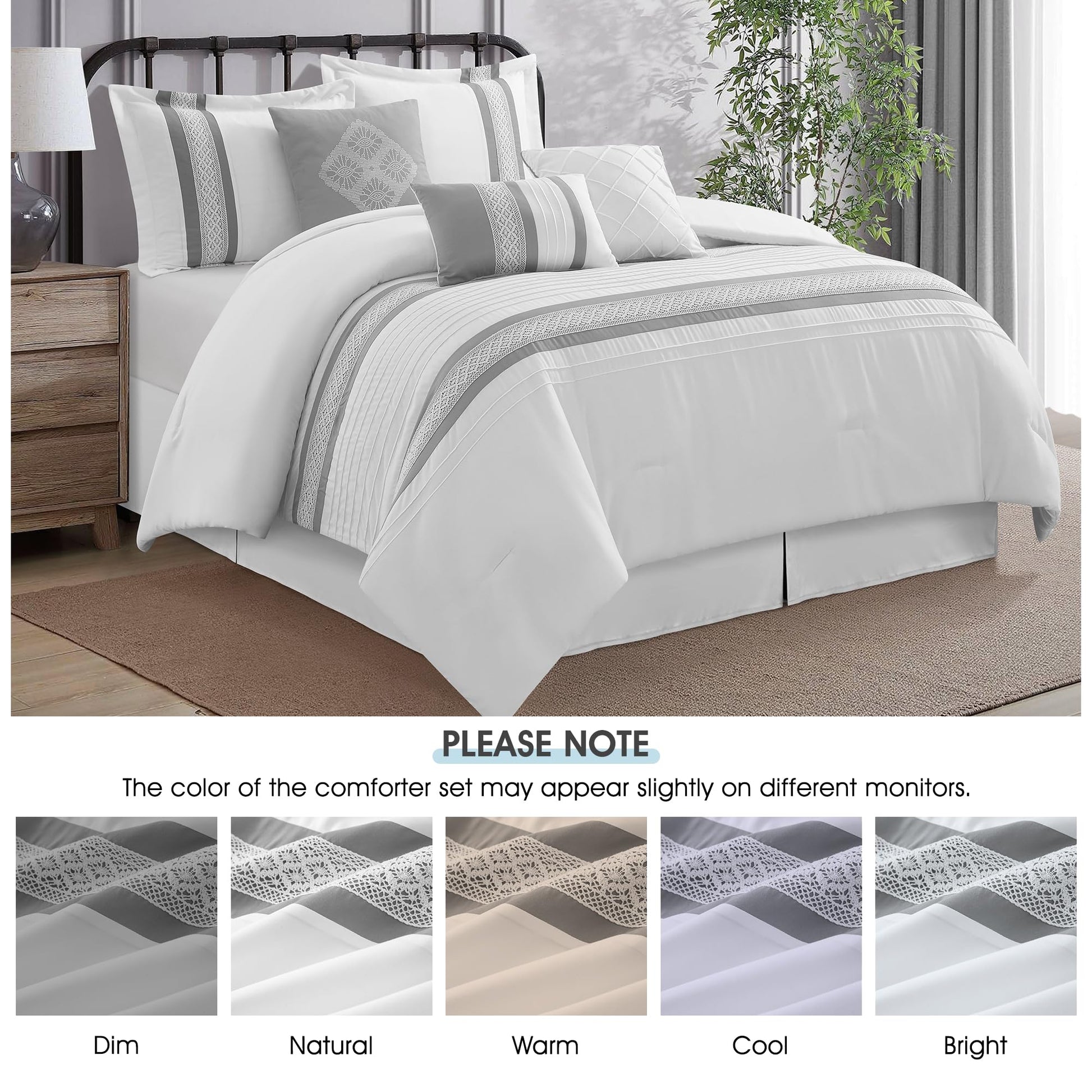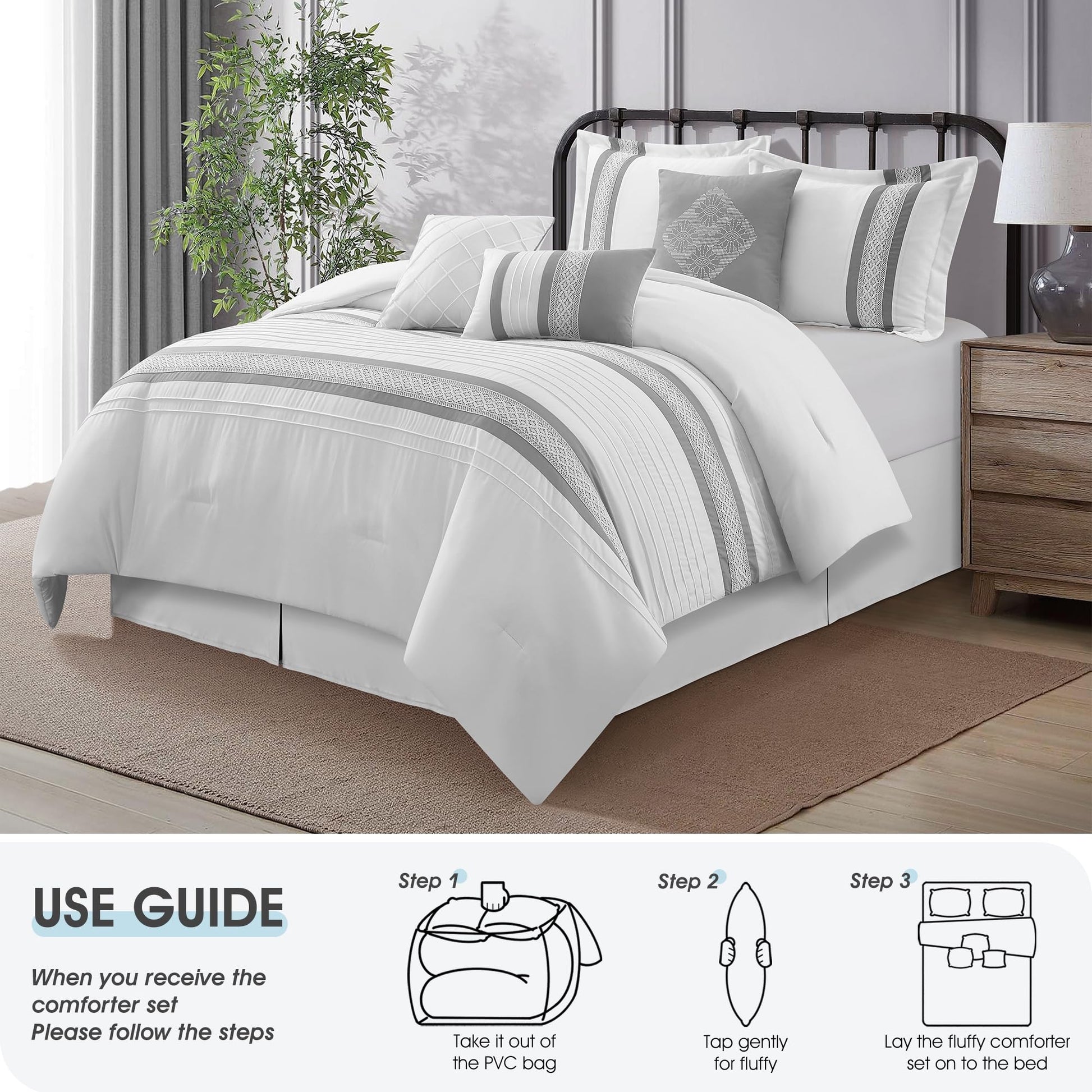 - Complete 7-Piece Set: Includes everything you need - comforter, bed skirt, pillow shams, and decorative pillows