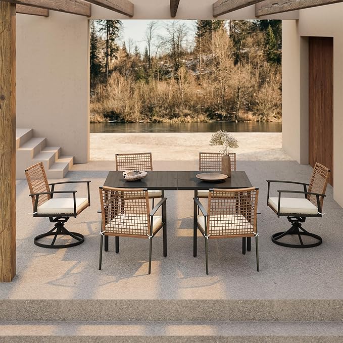Dining chairs feature high-quality PE wicker and heavy-duty steel frame with powder coating for extended protection against rust, scratches, and sun damage. This design ensures your patio set stays in perfect condition regardless of weather conditions.