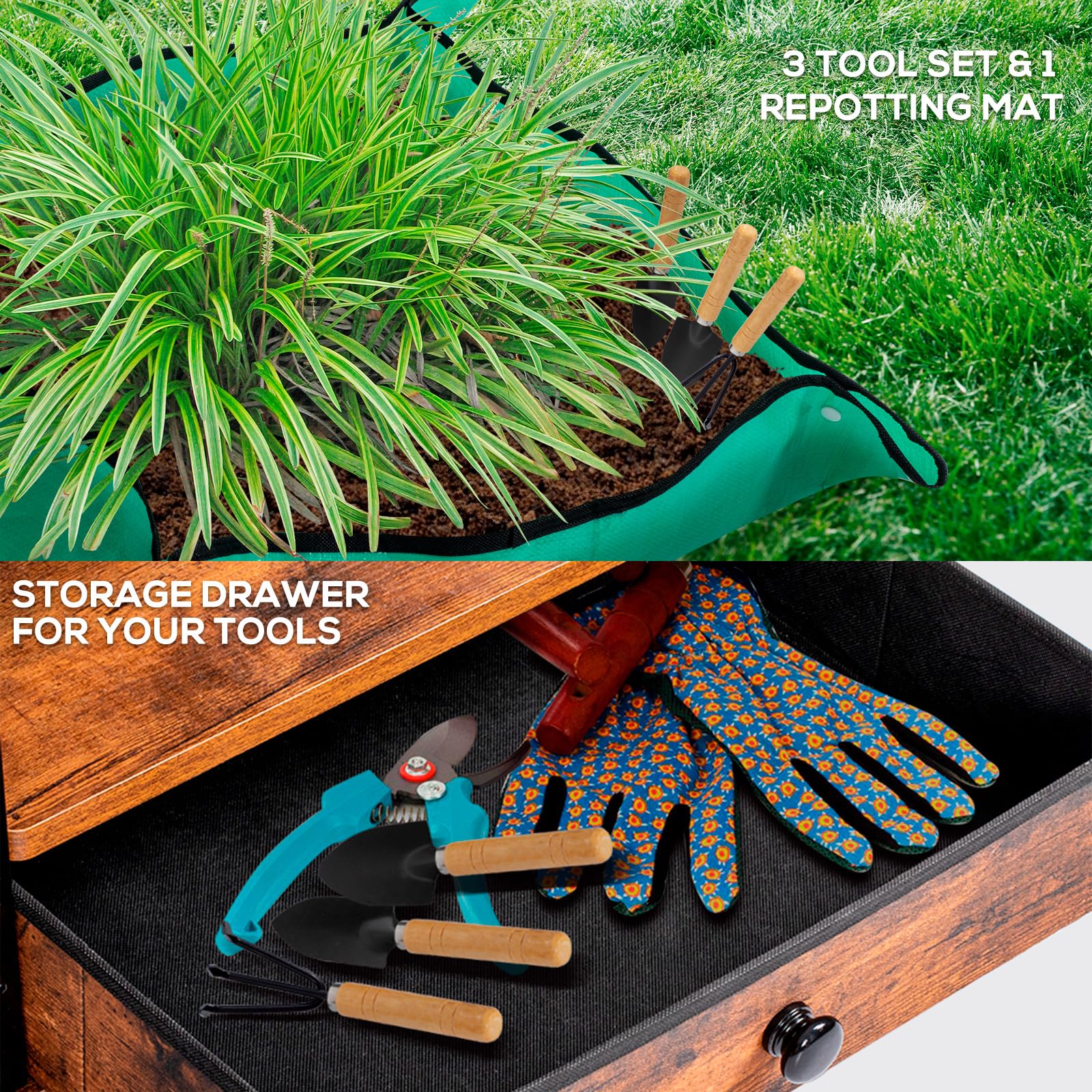 - Storage Drawer & Garden Tools: Includes built-in drawer, three gardening tools, and repotting mat for convenient plant care and organization
