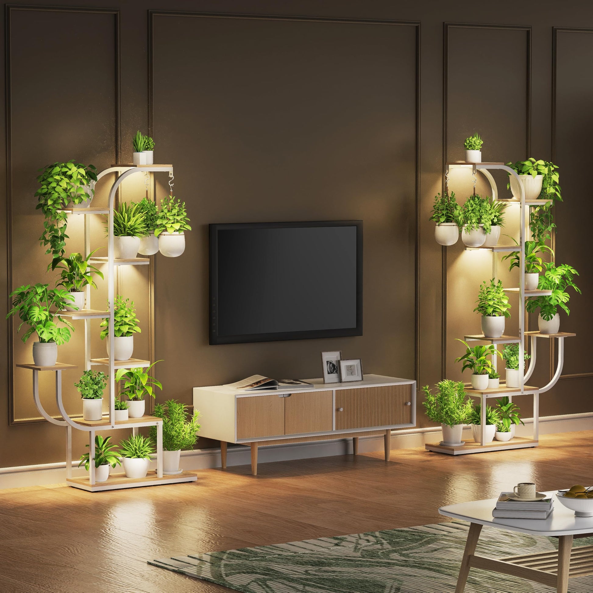 The white finish complements any home decor style, while the large curved design creates an eye-catching focal point in any room. Perfect for plant enthusiasts who want to maximize vertical space while keeping their collection healthy and beautifully displayed.