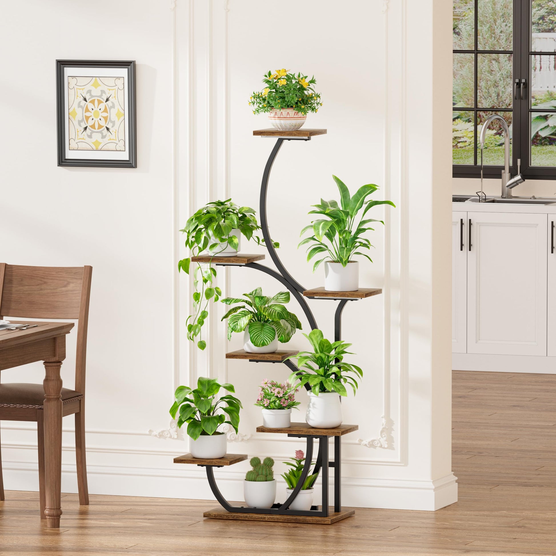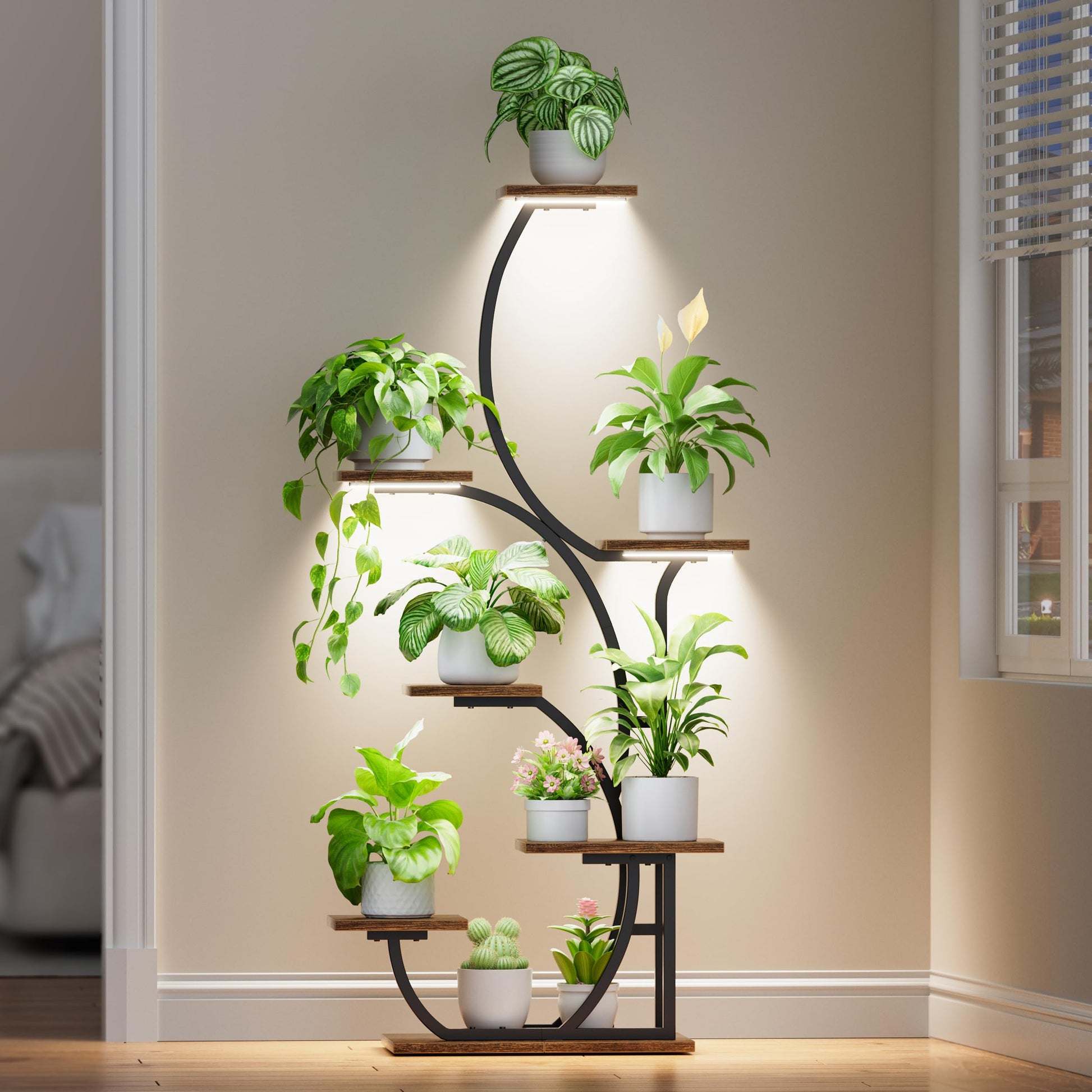 Transform any corner into a thriving indoor garden with this innovative 7-tier plant stand featuring integrated grow lights. The unique S-shaped curved design creates an organic, branch-like structure that seamlessly blends with your plants, adding natural elegance to living rooms, bedrooms, or porches.