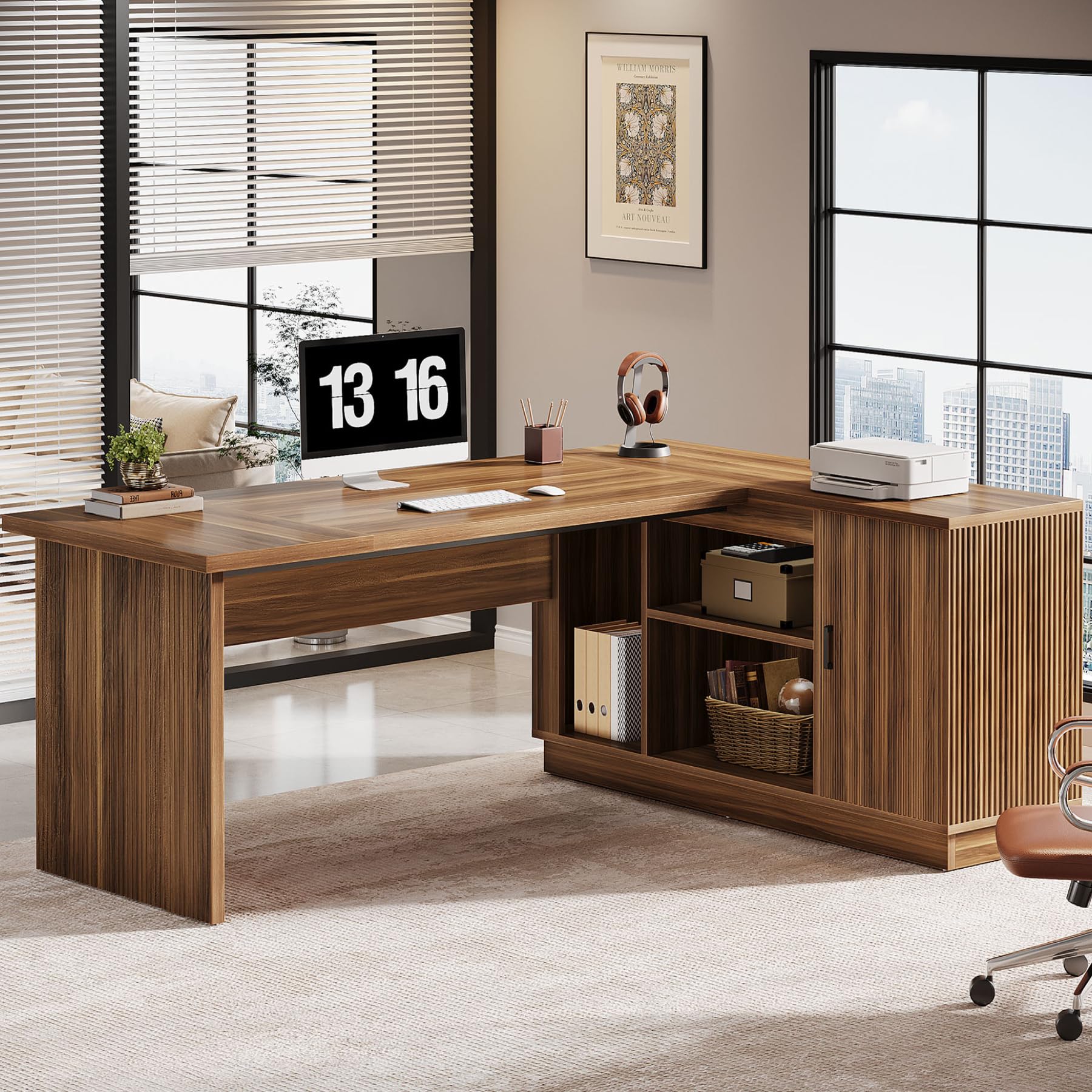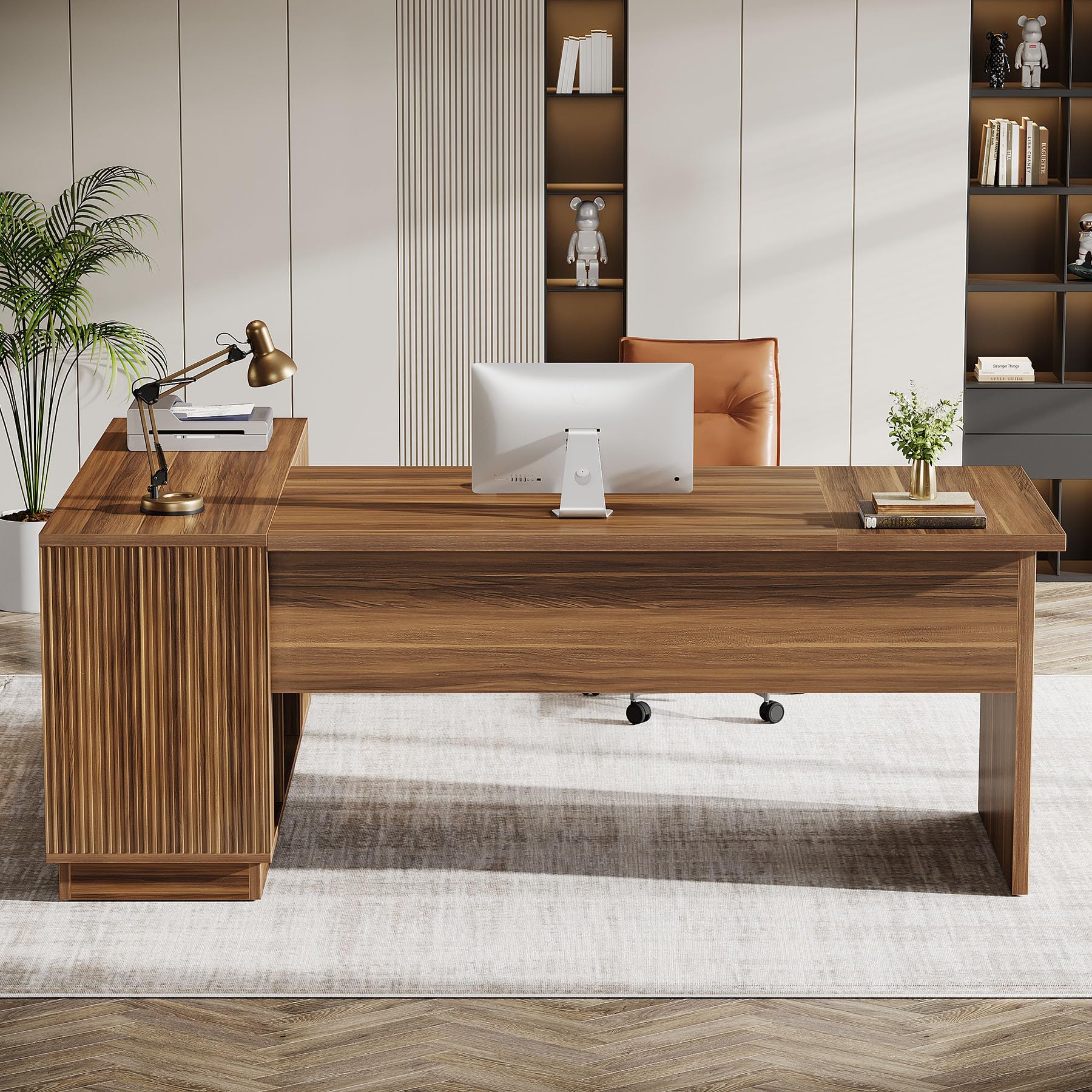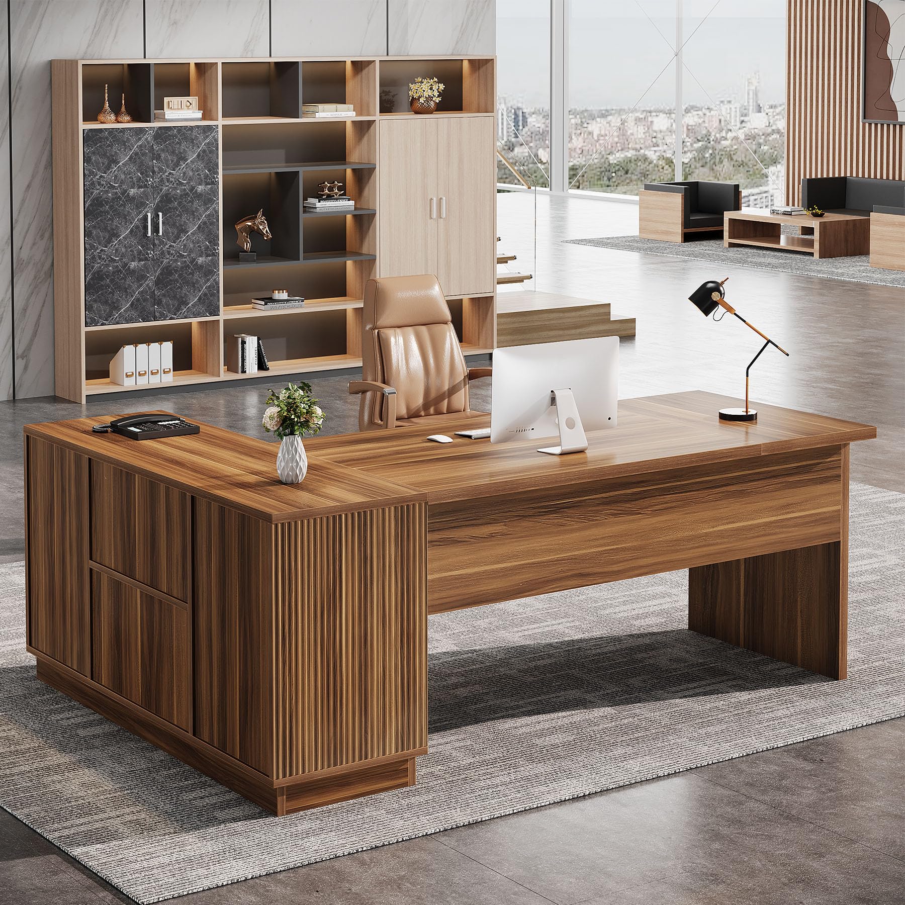 70.8-Inch Fluted Executive L-Shaped Desk with File Cabinet