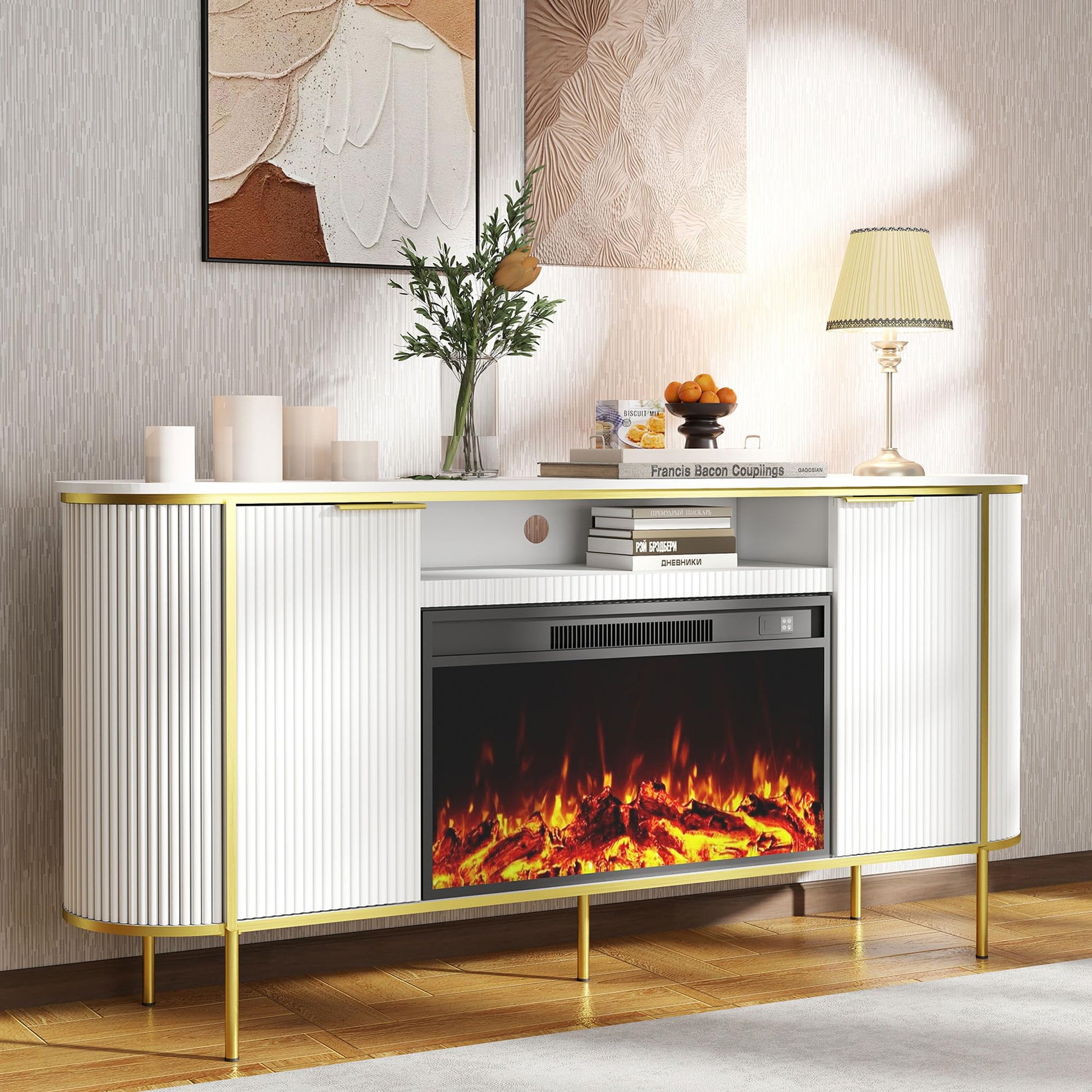 - Integrated 30-inch electric fireplace with realistic flame effects
