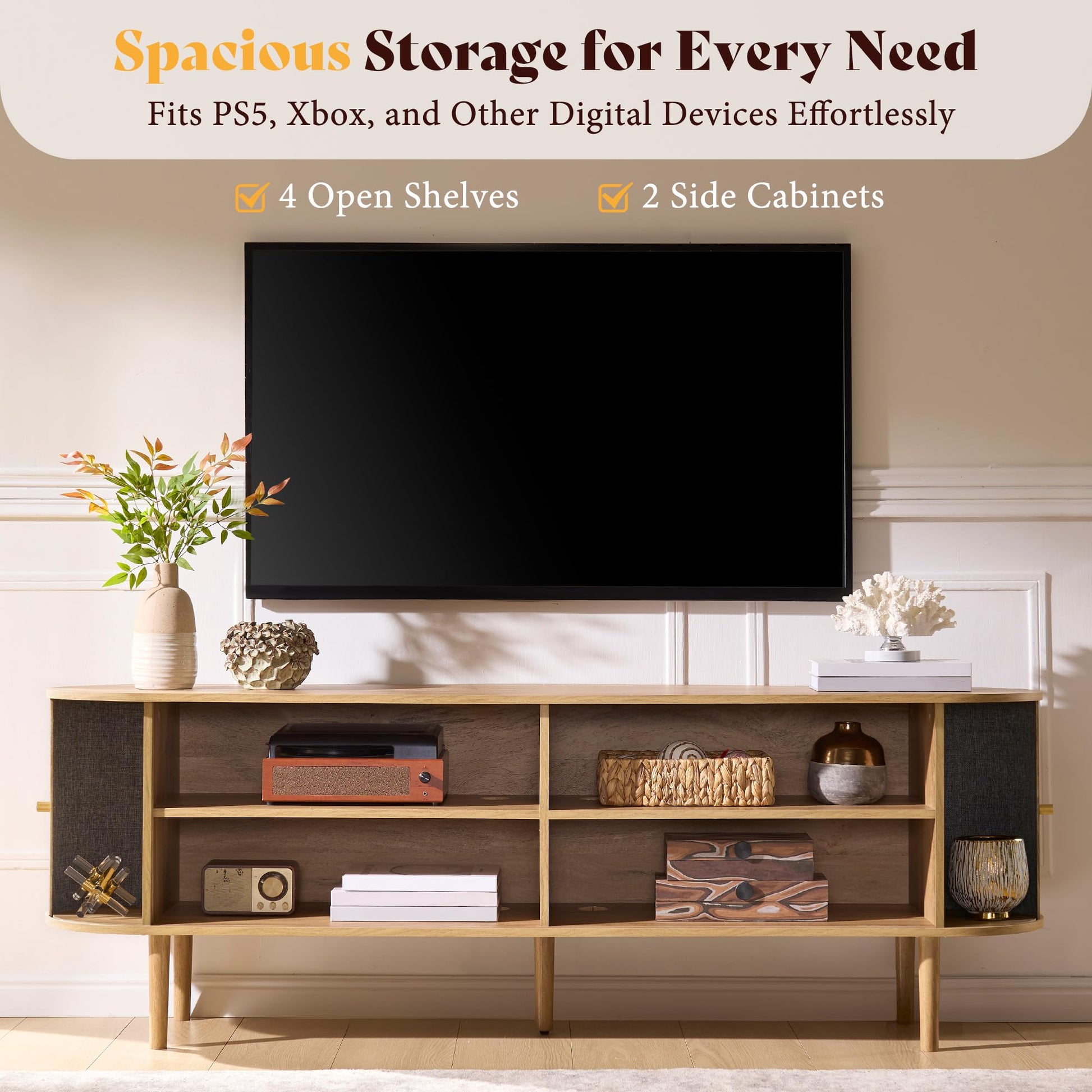This 70" mid-century modern TV stand combines functional storage with timeless design. Featuring a fluted sliding door, solid wood legs, and engineered wood construction, this entertainment center supports TVs from 55 to 80 inches while keeping your living space organized and stylish.