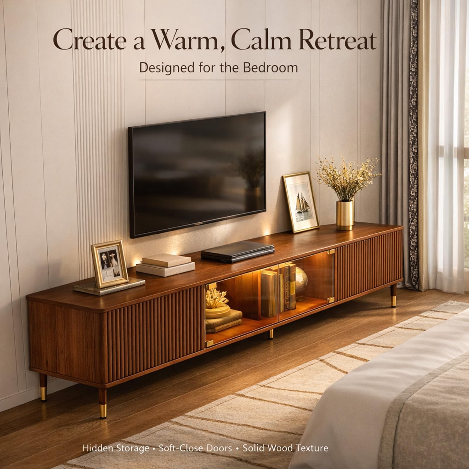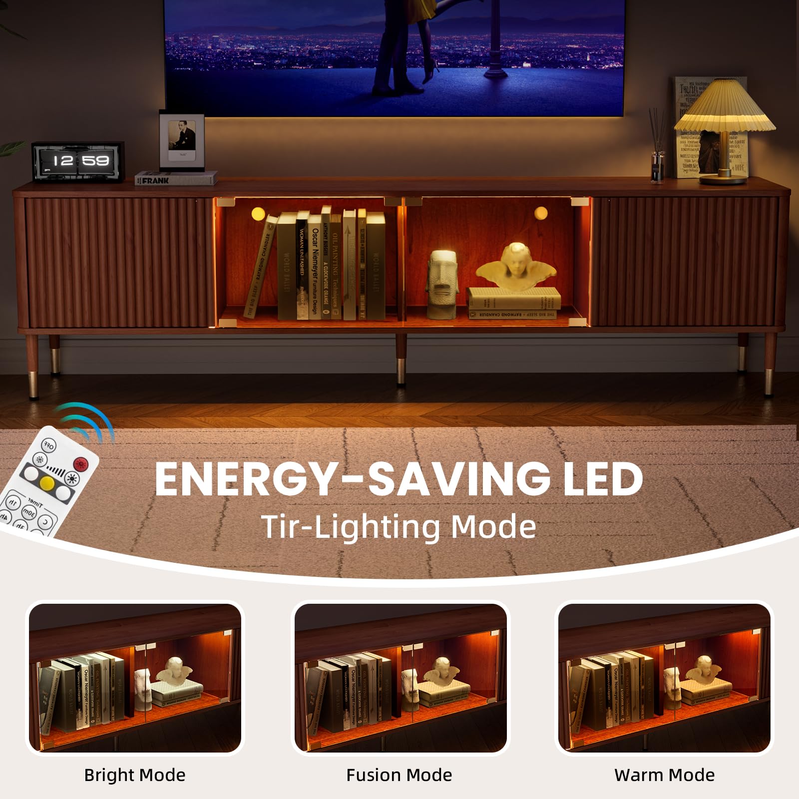 This entertainment center combines mid-century modern design with practical functionality, supporting TVs from 55 to 80 inches. The fluted design features rounded corners, wooden doors, tempered glass panels, and sleek golden legs for a refined aesthetic that complements contemporary living spaces.