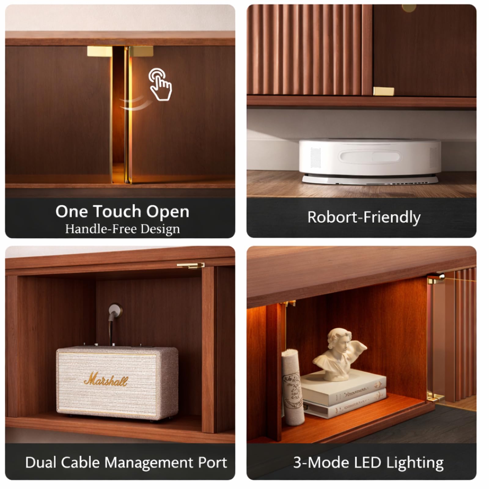 - Elegant Fluted Design: Refined fluted pattern with rounded corners for safety, combining wooden doors, tempered glass, and golden legs for a substantial yet balanced look