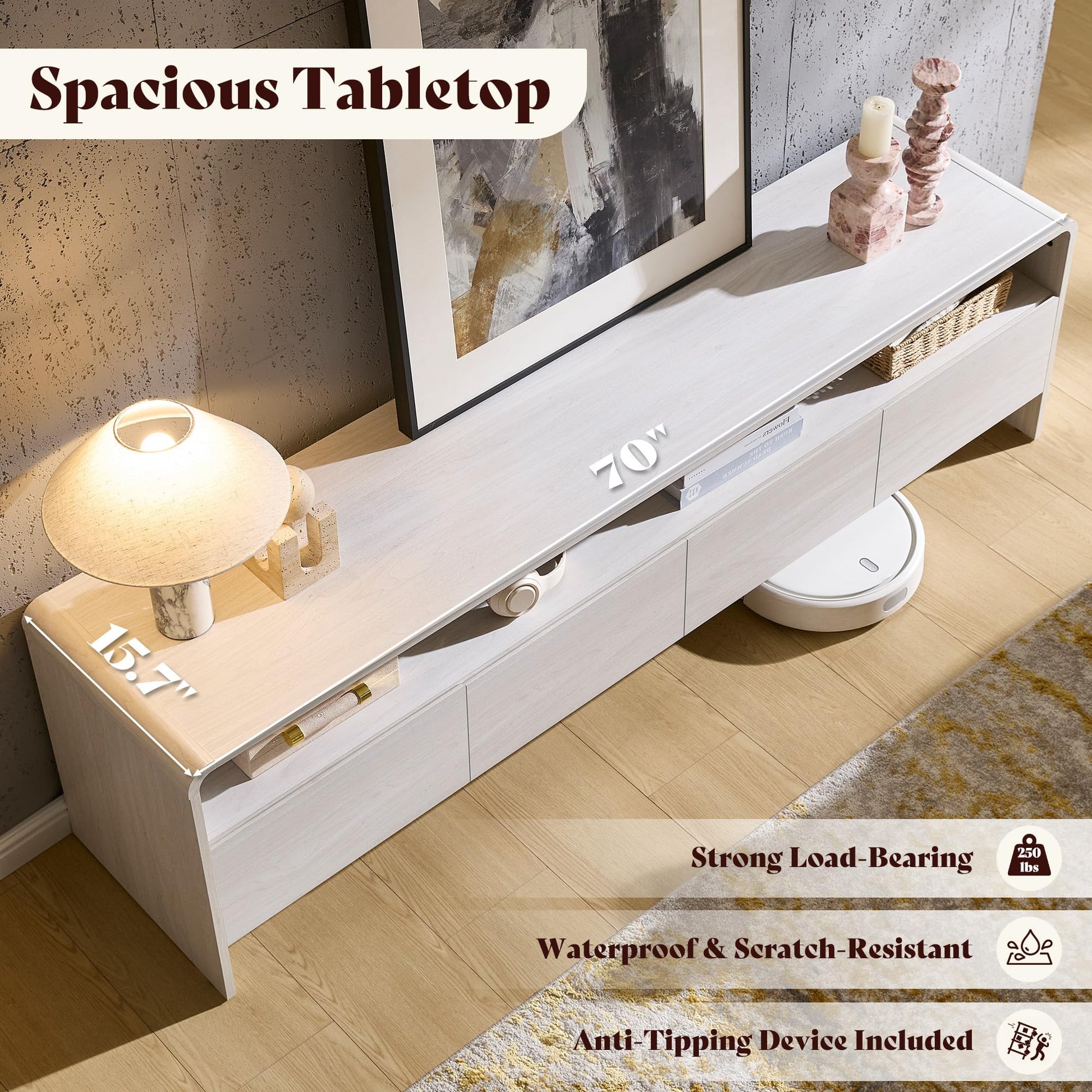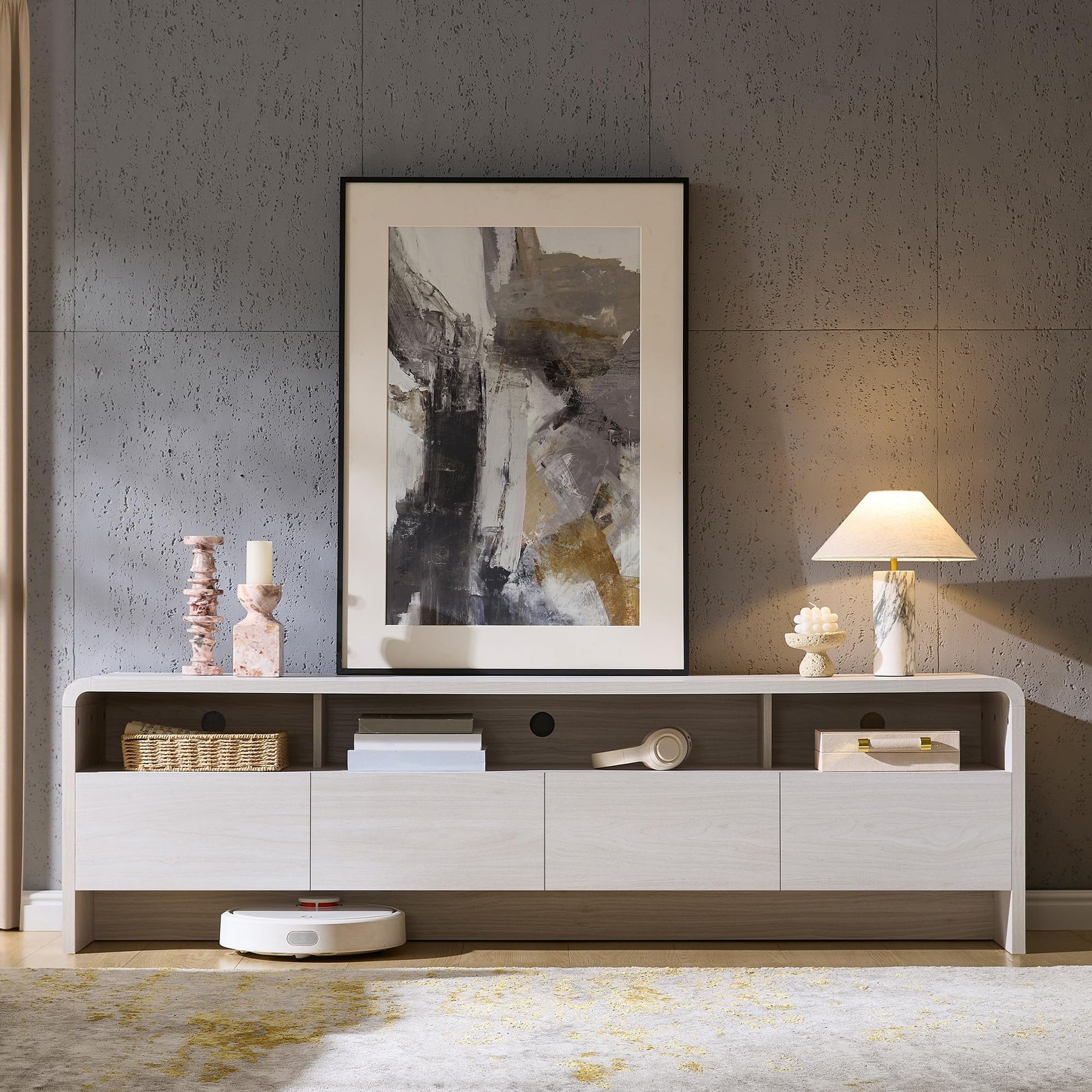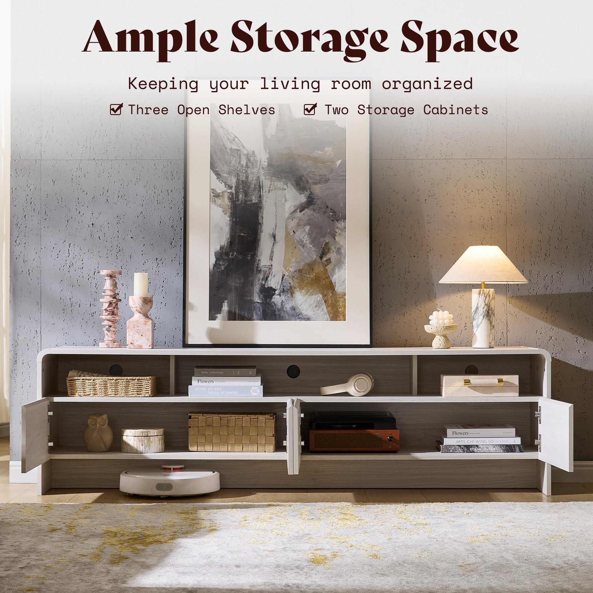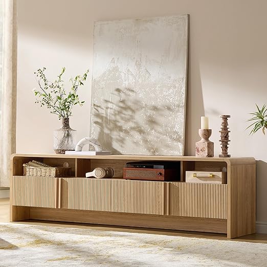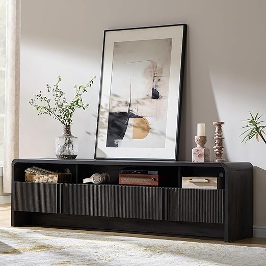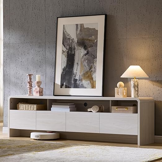 This modern TV stand features a sleek curved design that brings warmth and contemporary style to your living room. The smooth curved edges reduce sharp-corner risks, making it safer for families with children and pets.