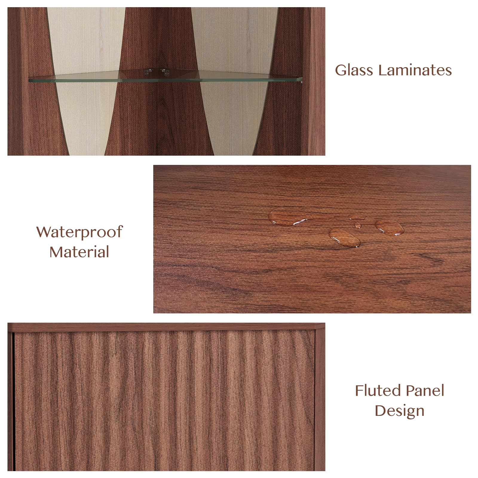 This elegant 70-inch tall corner bar cabinet combines mid-century modern design with practical functionality. Featuring built-in lighting to showcase your glassware and decor, this space-saving corner cabinet is perfect for living rooms, dining rooms, kitchens, or bedrooms. The walnut finish adds sophistication while the fluted panel doors provide a distinctive aesthetic.