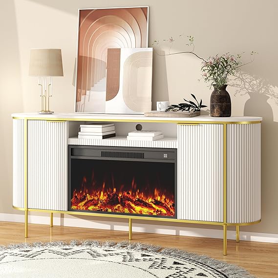 This modern white TV stand combines elegant fluted panel design with functional storage, perfect for living rooms, bedrooms, or media spaces. The faux marble tabletop adds a touch of luxury while providing ample surface area for TVs up to 75 inches.