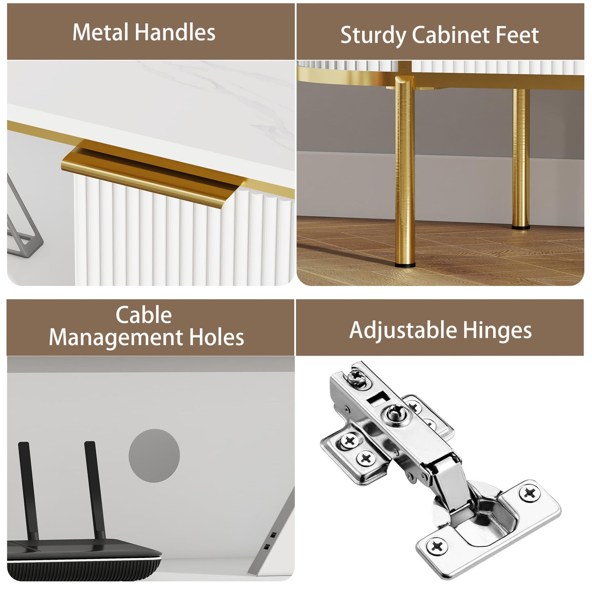 This elegant TV stand features a sophisticated design with fluted groove panels and smooth curved contours that create a unique visual effect. The faux marble tabletop delicately replicates natural marble texture, paired with gold metal accents that enhance the overall luxury of your home while adding artistic flair.