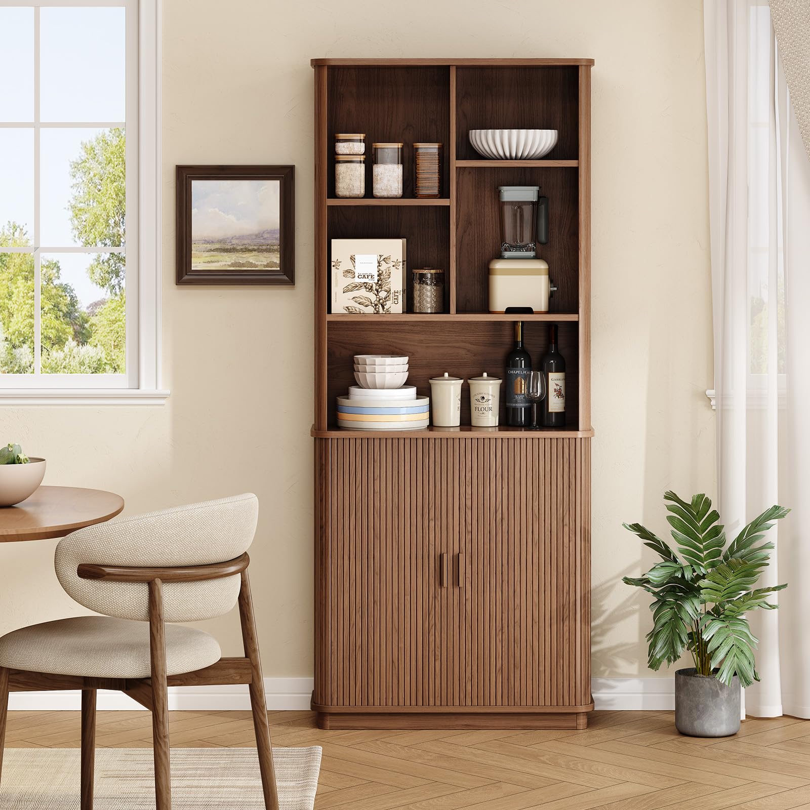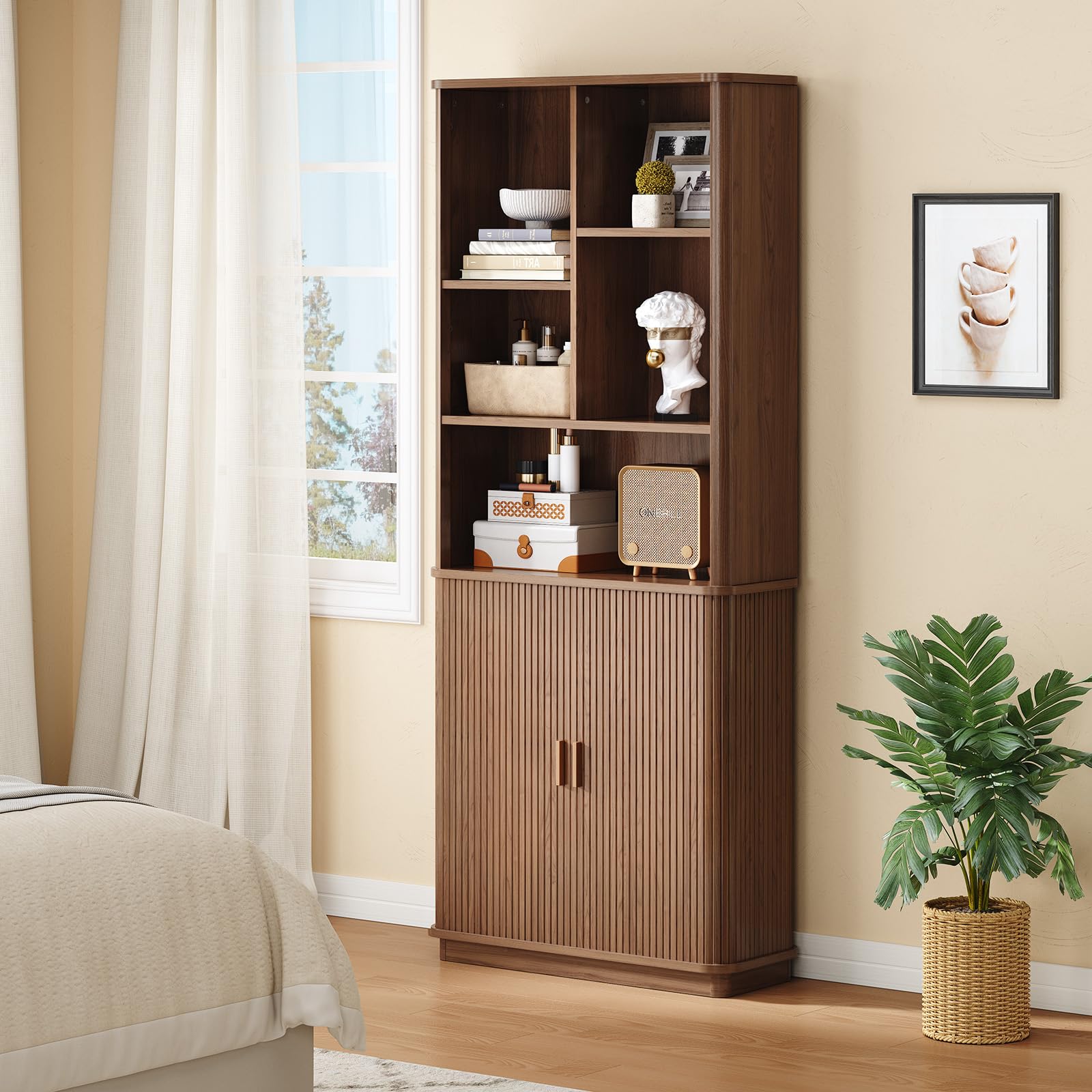 This modern curved bookshelf combines elegant design with practical functionality. Featuring a unique tambour sliding door storage cabinet and seven adjustable shelves, this freestanding bookcase offers versatile storage solutions for any living space, home office, bedroom, or study room.