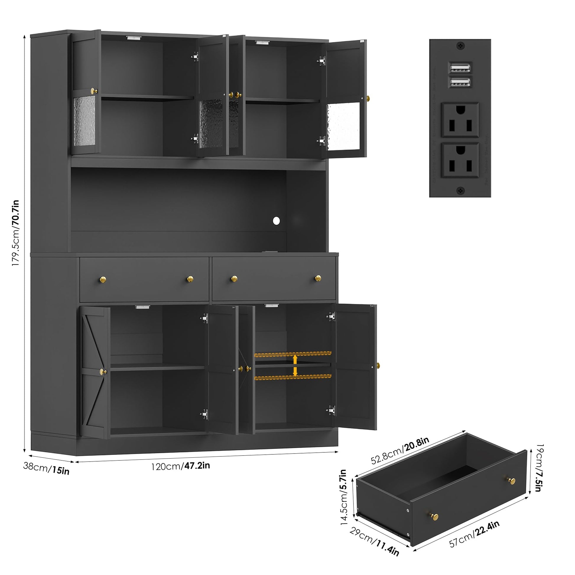 This farmhouse-style pantry cabinet combines functional storage with modern convenience. Featuring integrated LED lighting and a built-in charging station, this versatile piece serves as both a kitchen hutch and microwave stand. The open countertop design provides easy access to frequently used appliances while maximizing storage capacity.