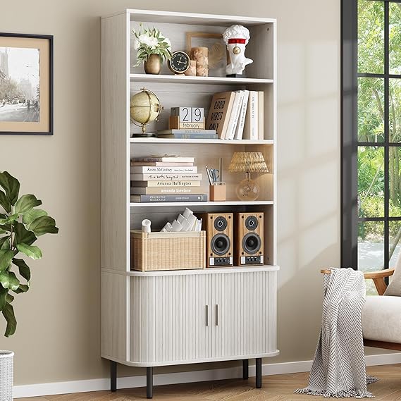 This modern 71-inch tall bookshelf combines open display space with concealed storage, offering a versatile solution for organizing books, decorative items, and personal belongings in your home or office.