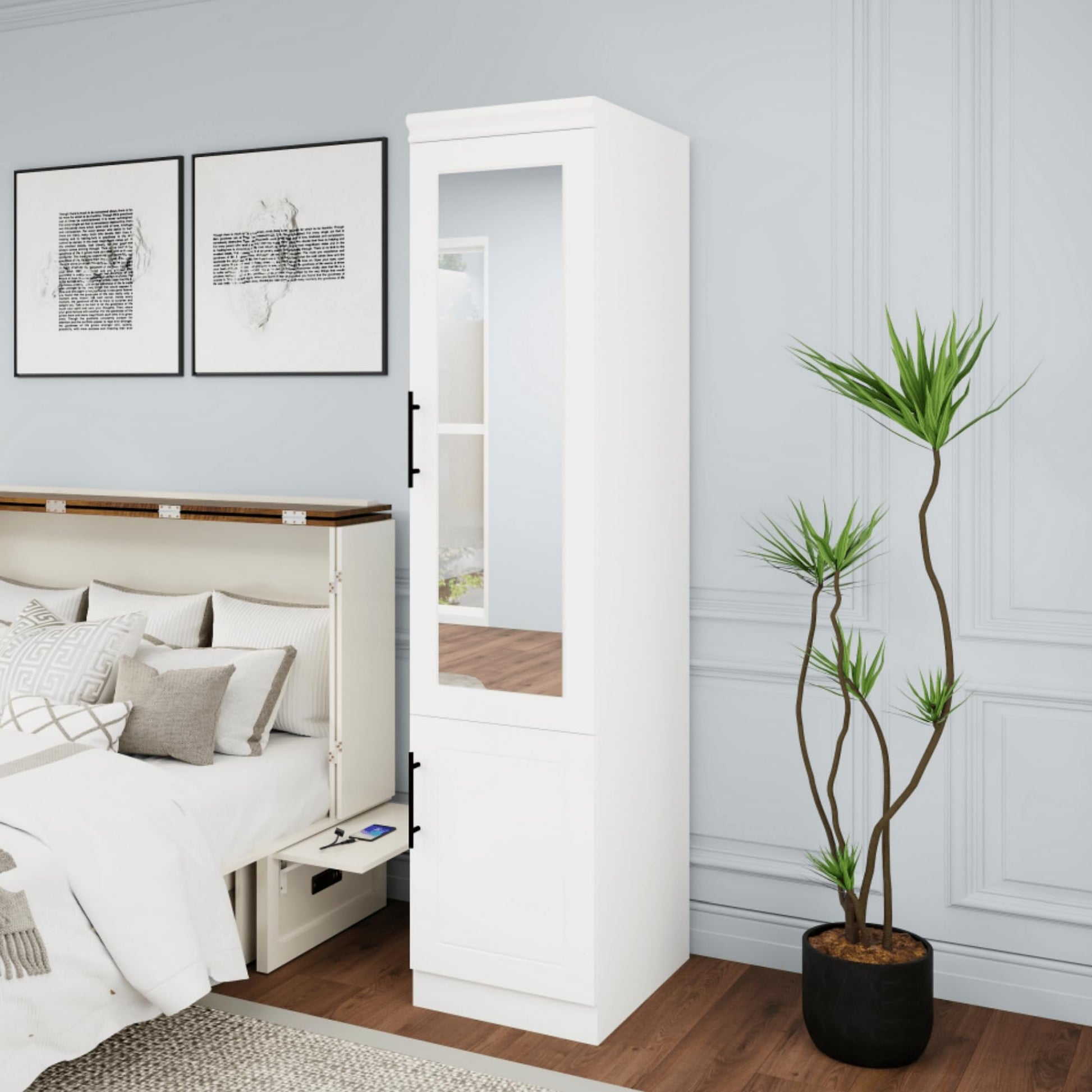 This elegant white wardrobe closet combines spacious storage with modern design, perfect for organizing your bedroom essentials. Featuring a silent glide door system and sturdy wooden construction, this armoire offers both functionality and style.