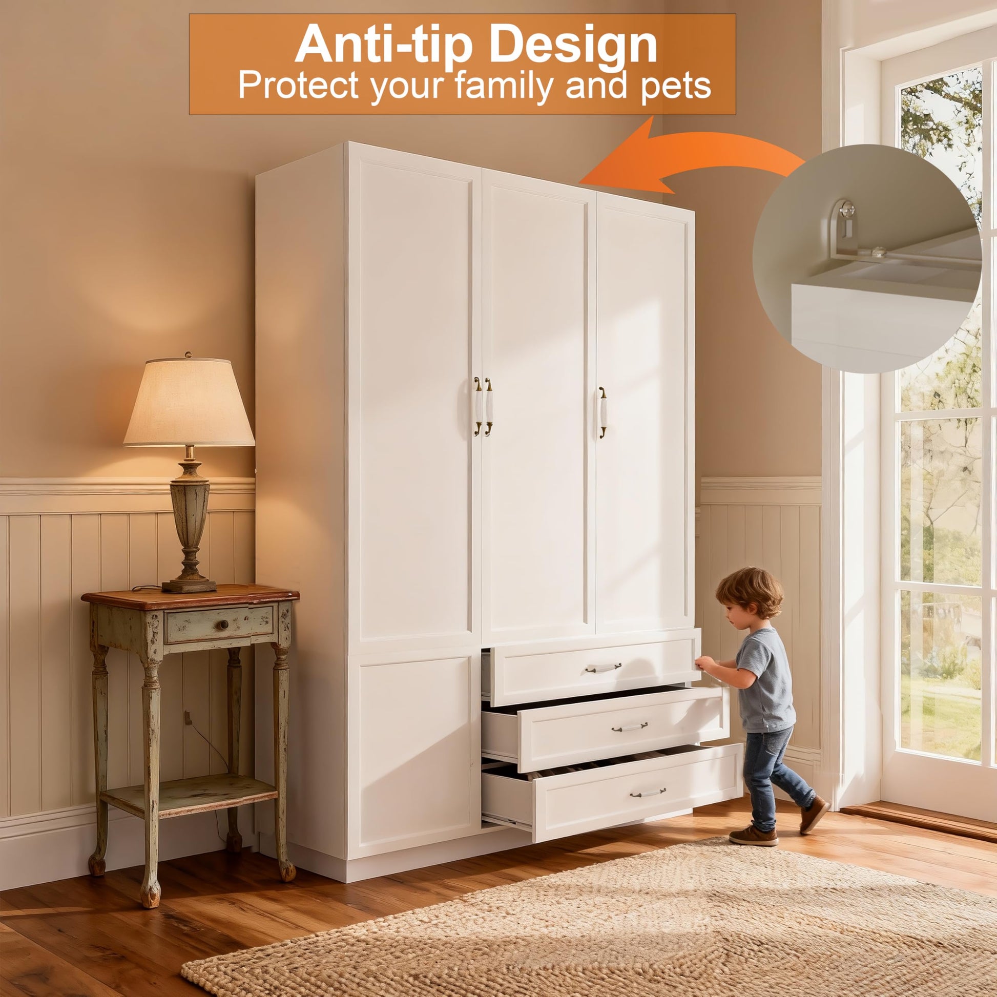 - Versatile Storage Solutions: Two hanging sections with removable rods at optimal height for long garments, three deep drawers, and additional cabinet space for maximum organization.