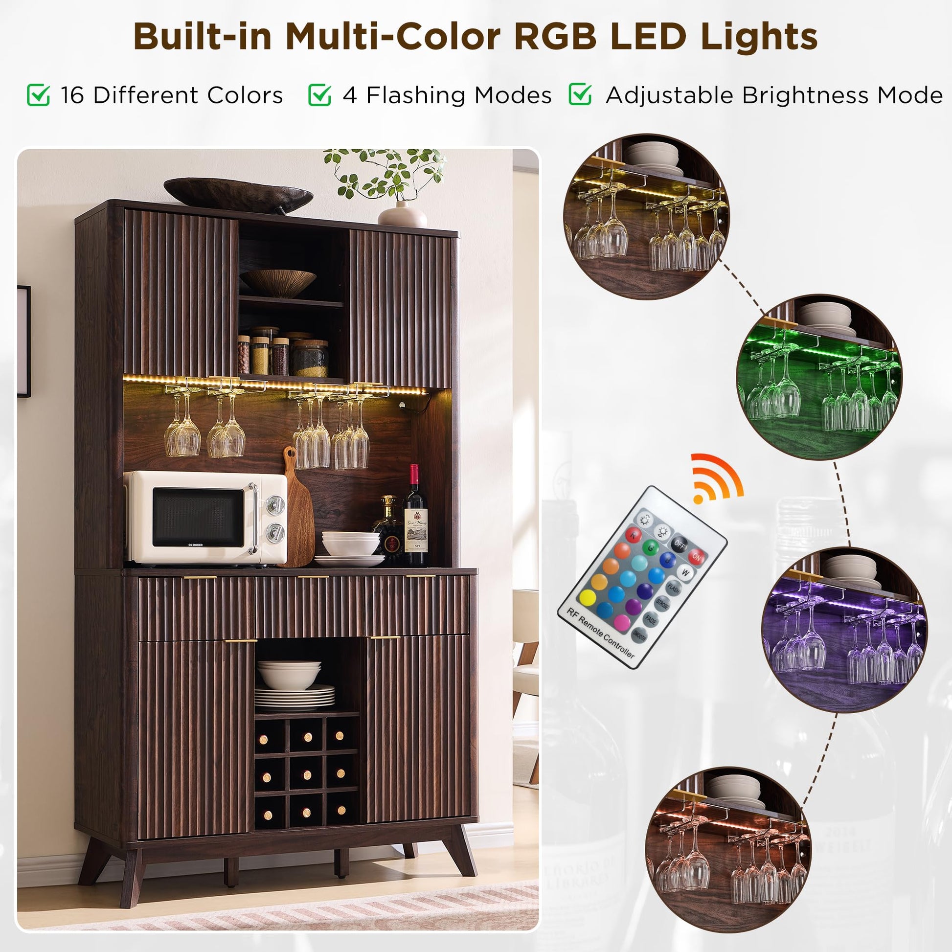 72" Tall Wine Bar Cabinet with Storage Hutch and LED Lights