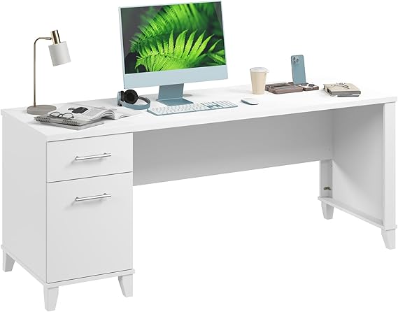 An expansive work surface and built-in storage make this 72W Office Desk with Drawers a perfect choice for your home office. The spacious desktop offers plenty of room to spread out with a computer and paperwork and includes a convenient wire management grommet to keep cords and cables secure and out of sight.