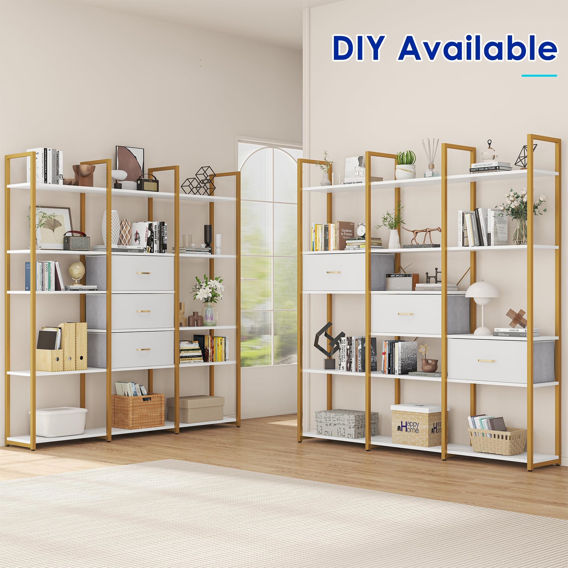 This large etagere bookshelf works beautifully as a bookcase, kitchen rack, bathroom shelf, or office storage solution. The industrial design with gold accents complements modern, contemporary, and transitional interiors.