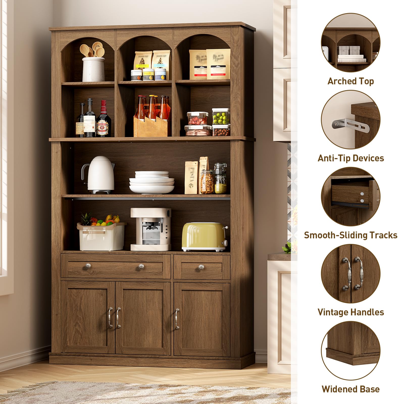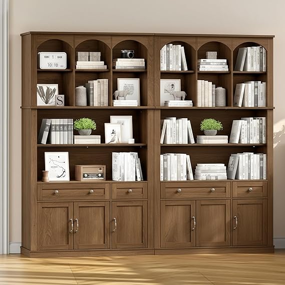 This tall farmhouse arched bookshelf combines mid-century modern design with practical storage solutions. Featuring 6 spacious tiers, one drawer, and one door cabinet, this floor-standing display unit offers versatile organization for books, décor, and essentials.