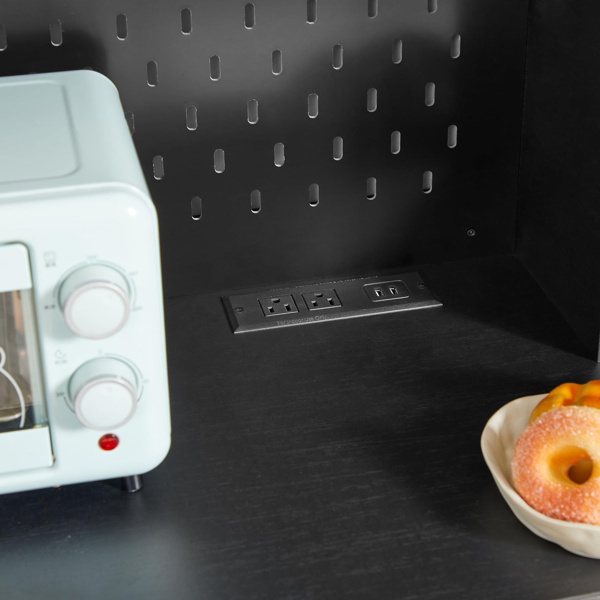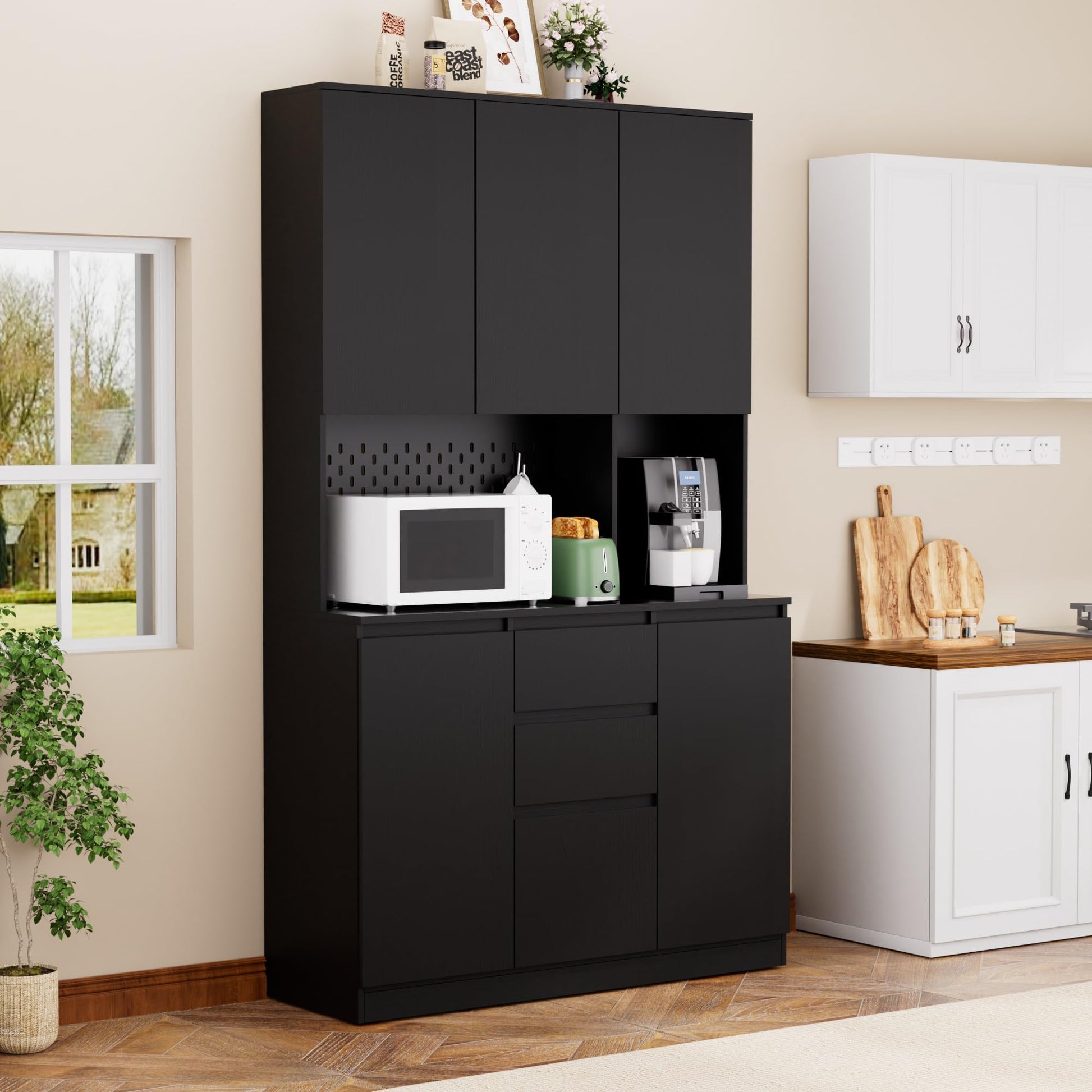 This tall kitchen hutch is perfect for kitchens, pantries, dining rooms, or any space requiring additional storage. The power outlet feature makes it ideal for housing microwaves, coffee makers, or other small appliances, while the LED lighting ensures easy visibility of stored items.
