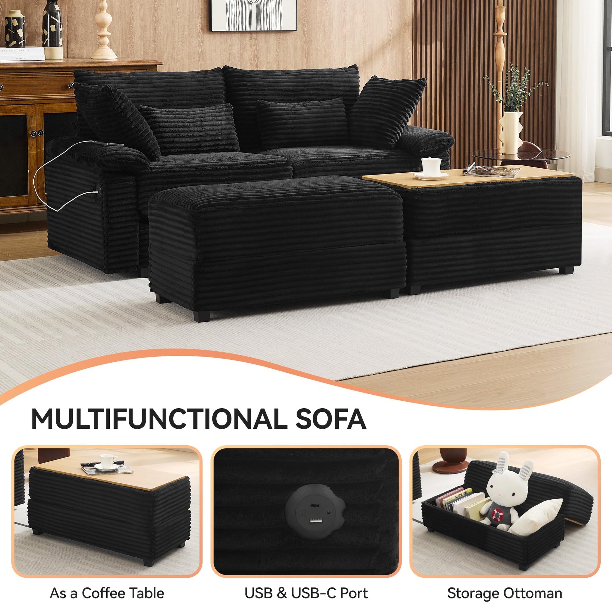 75" Corduroy Loveseat with Storage Ottoman & USB, Cloud Deep Seat Couch with Convertible Ottoman Coffee Table, Double Chaise Lounge for Living Room, Corduroy Black