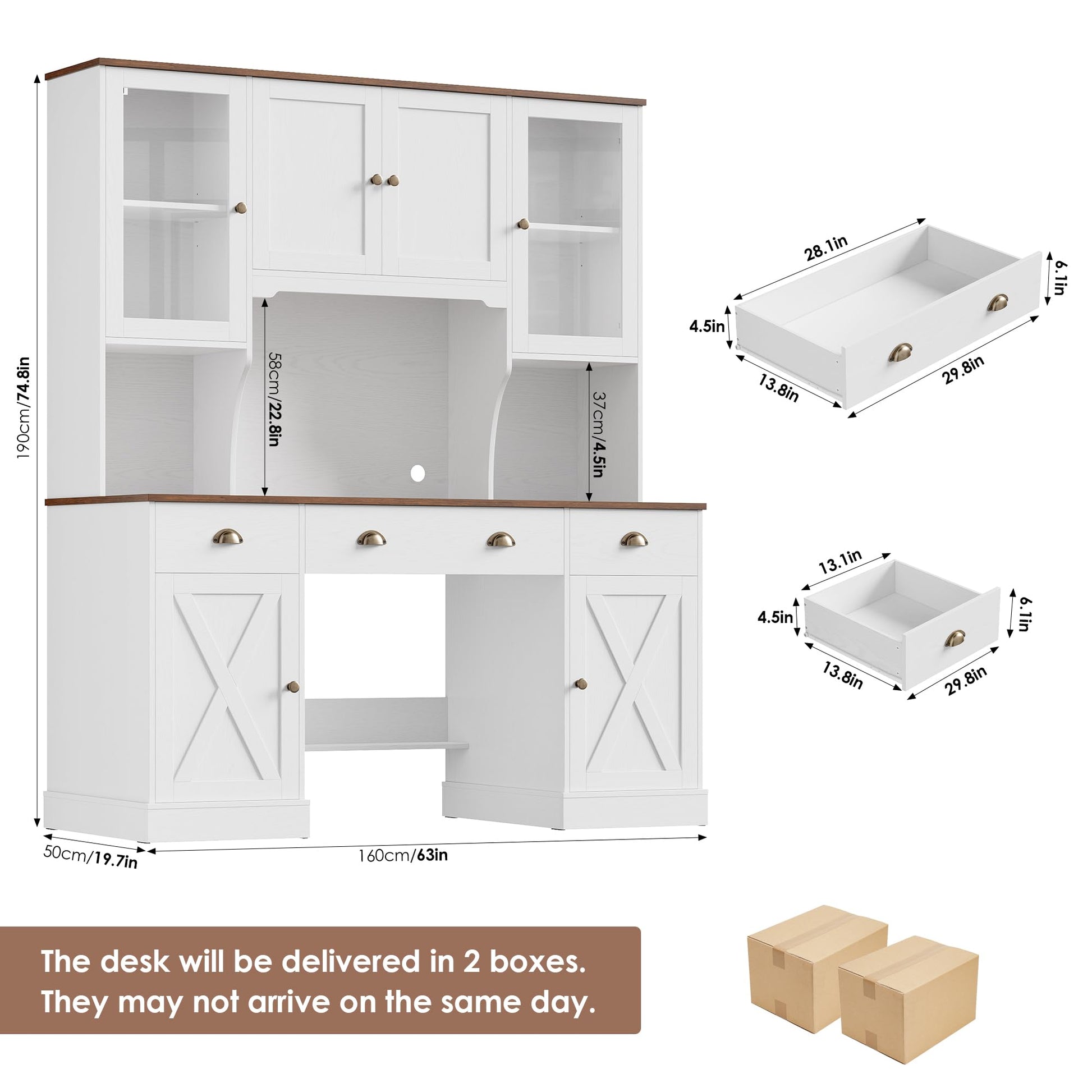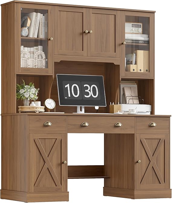 Transform your workspace with this comprehensive executive desk system featuring an integrated hutch, multiple drawers, and a glass-door storage cabinet. Designed for maximum productivity and organization, this large farmhouse-style workstation provides ample surface area and storage solutions for your home office, study, or gaming setup.