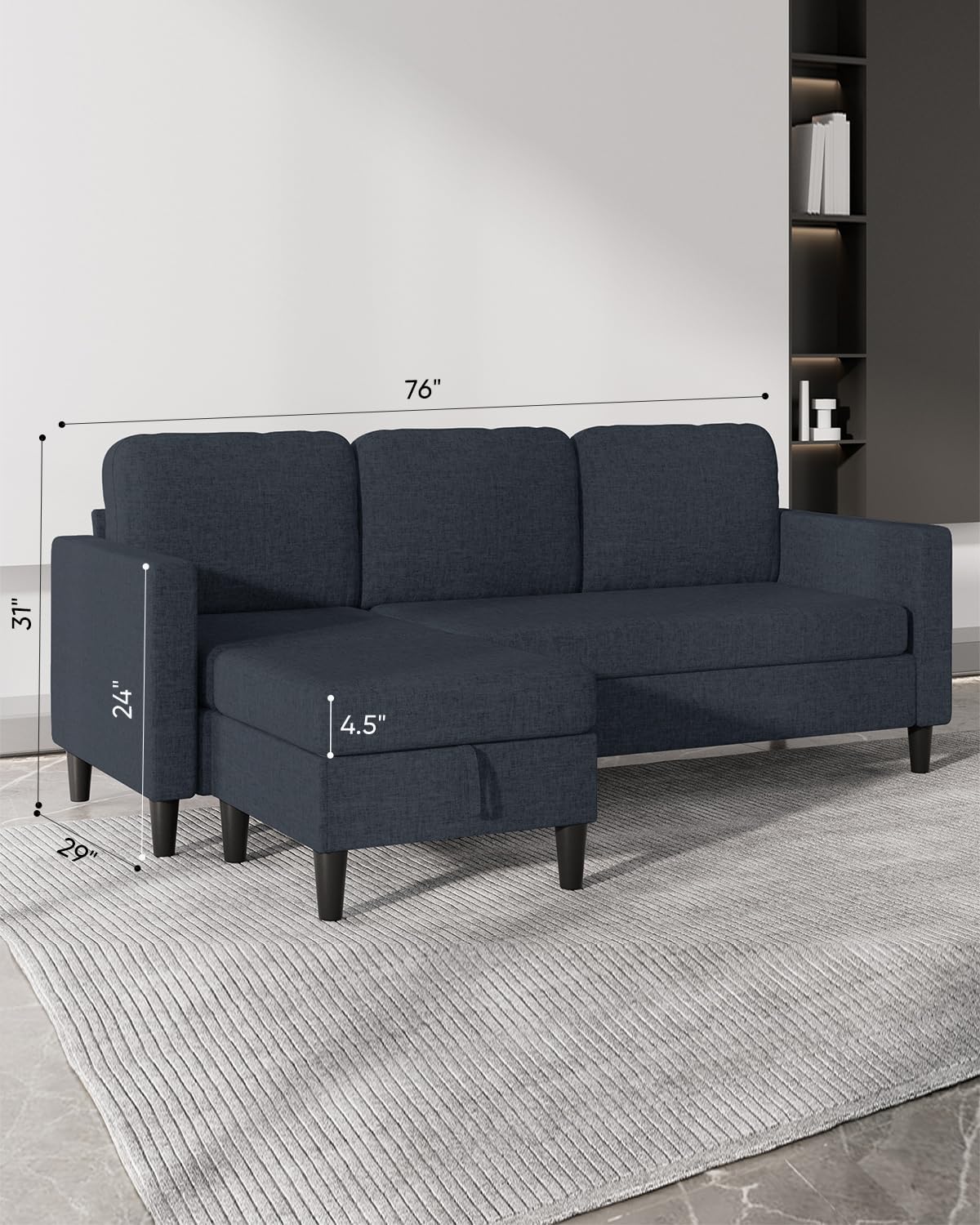 Transform your living space with this spacious 76-inch L-shaped sectional sofa. Featuring a streamlined design with crisp contours and elegant aesthetics, this modern couch includes a storage ottoman for enhanced comfort and versatility. Perfect for creating an intimate gathering space in your living room or apartment.
