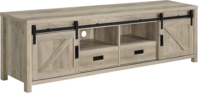 Features two open shelves for convenient access to frequently used items and hidden storage behind sliding barn doors to keep clutter out of sight. Perfect for organizing media players, gaming consoles, DVDs, and entertainment accessories.